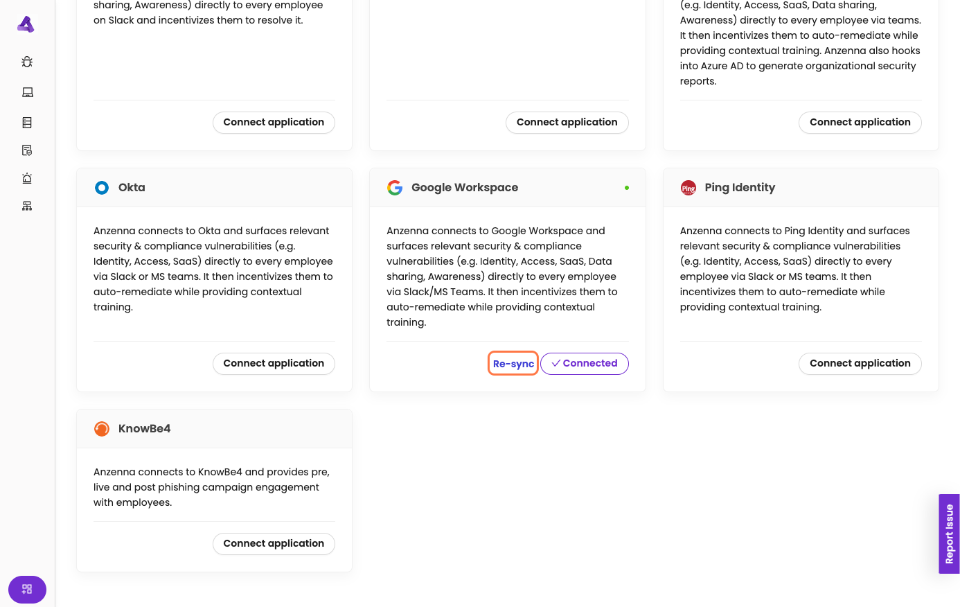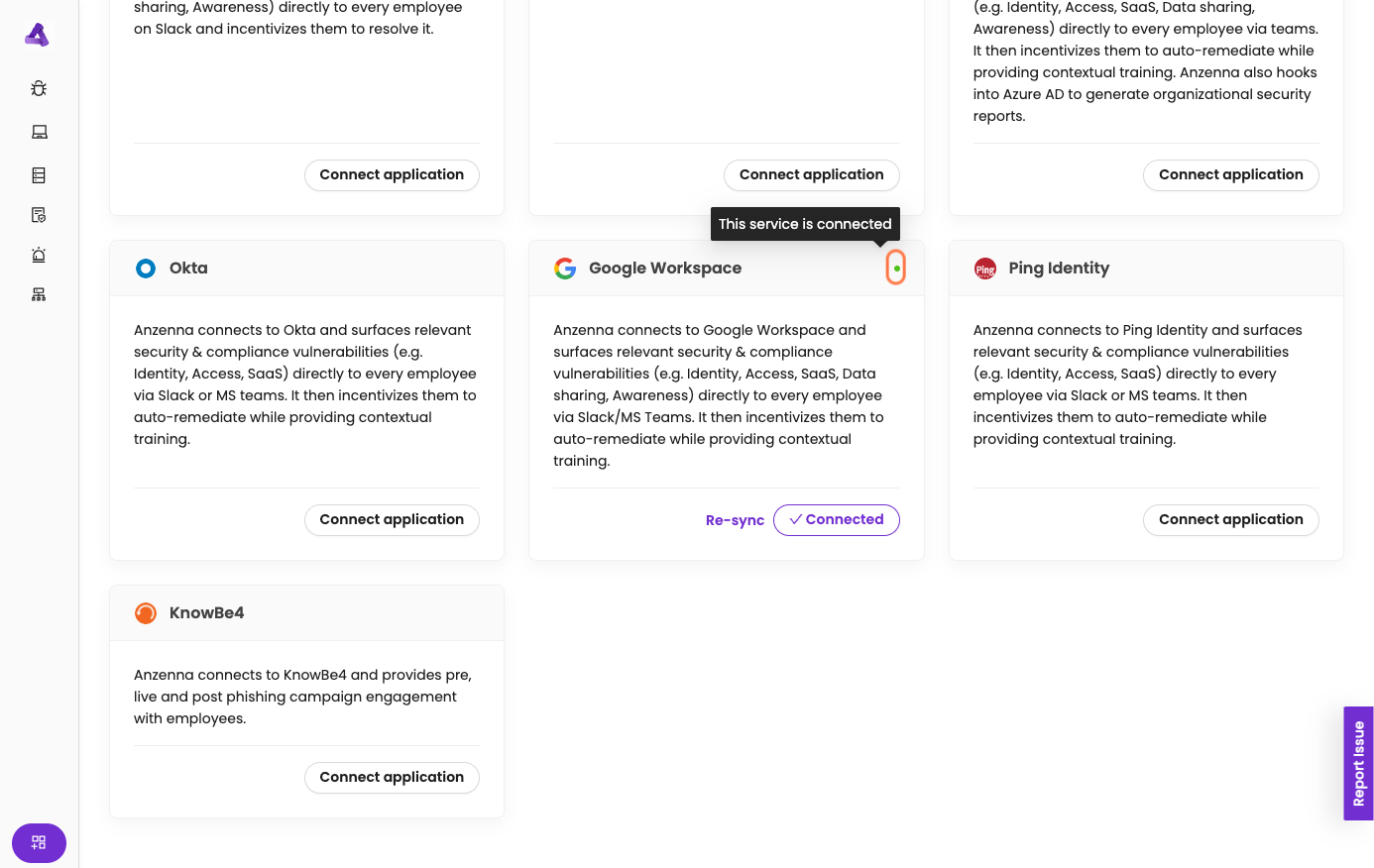 Anzenna is now connected to Google Workspace and will begin monitoring your users, devices, Drive activity, and alerts.