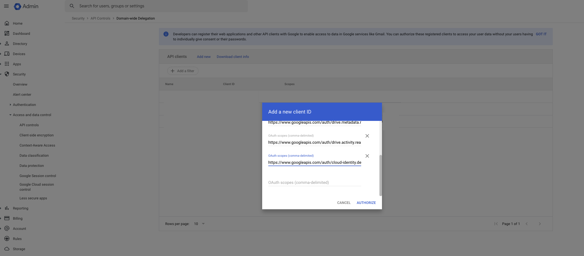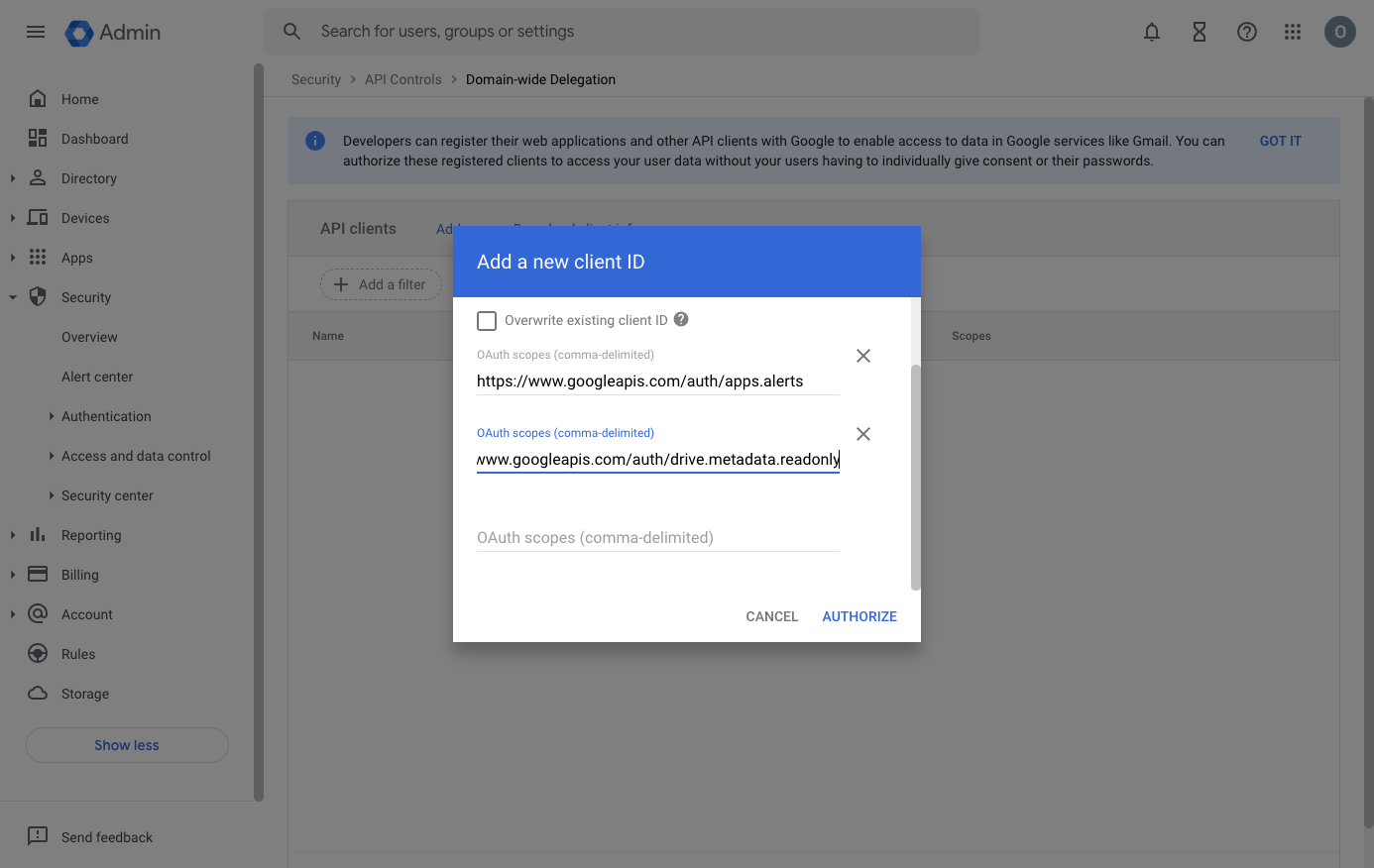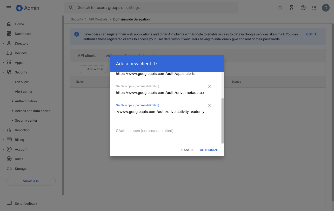 - Go to Google Admin Console > Security > API Controls > Domain-wide Delegation