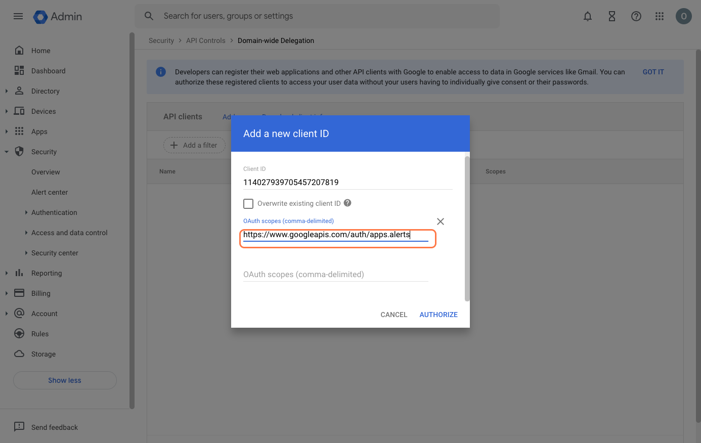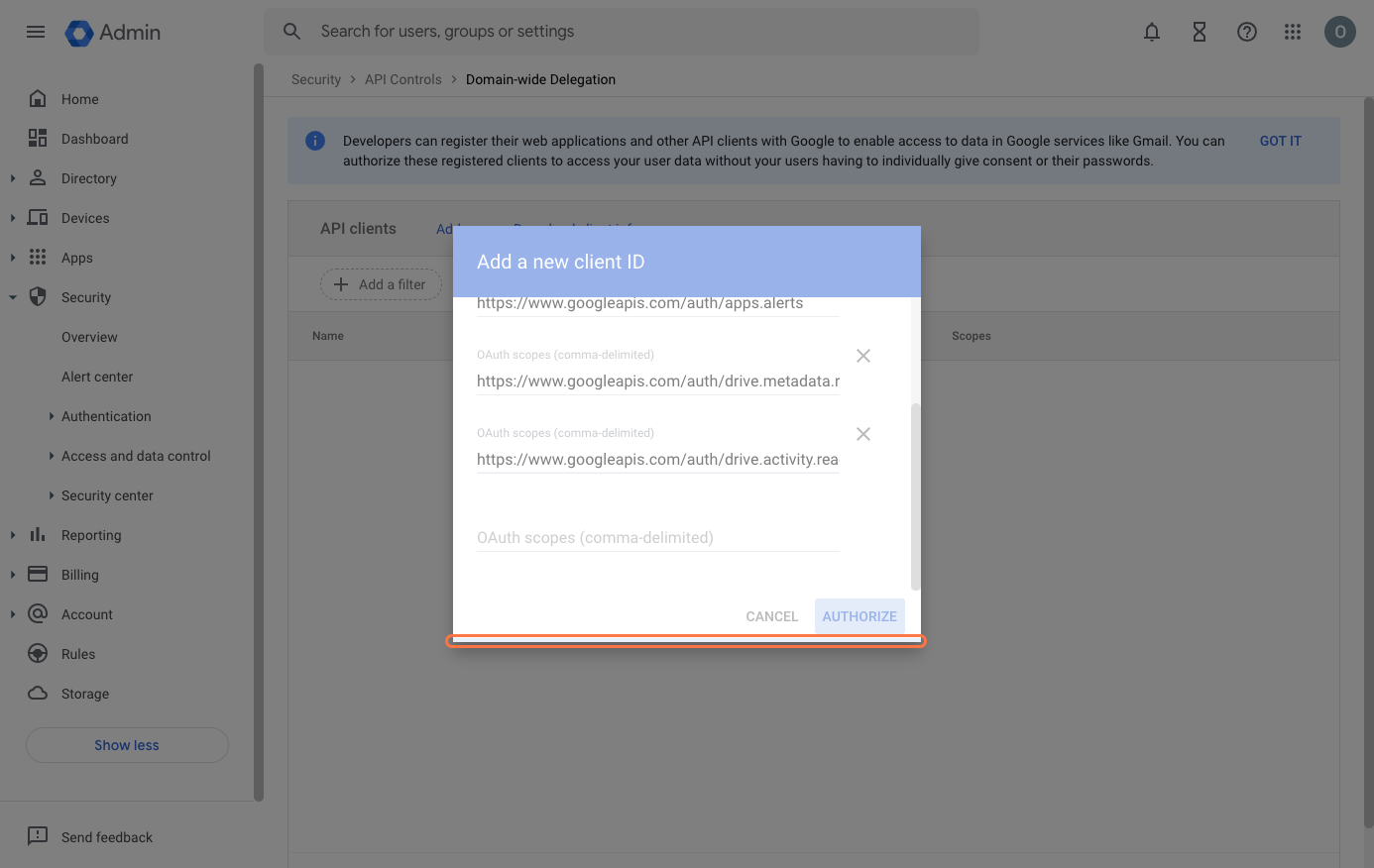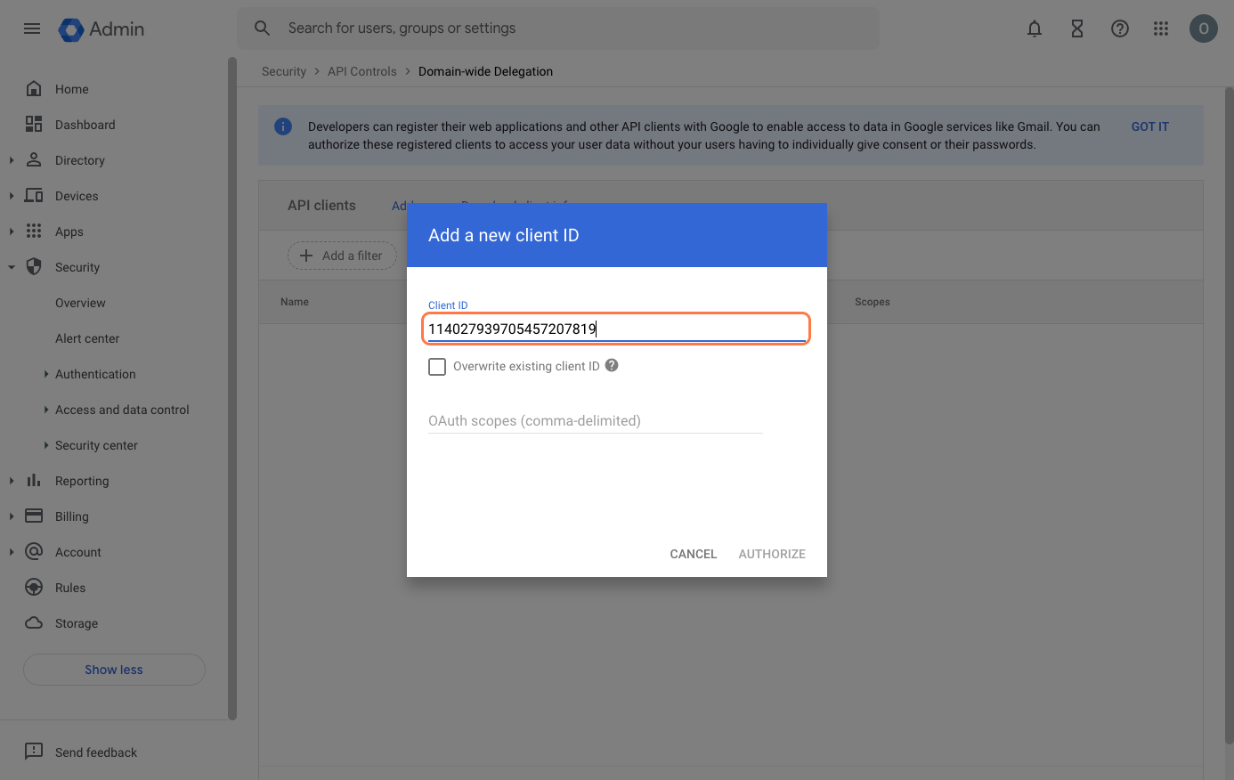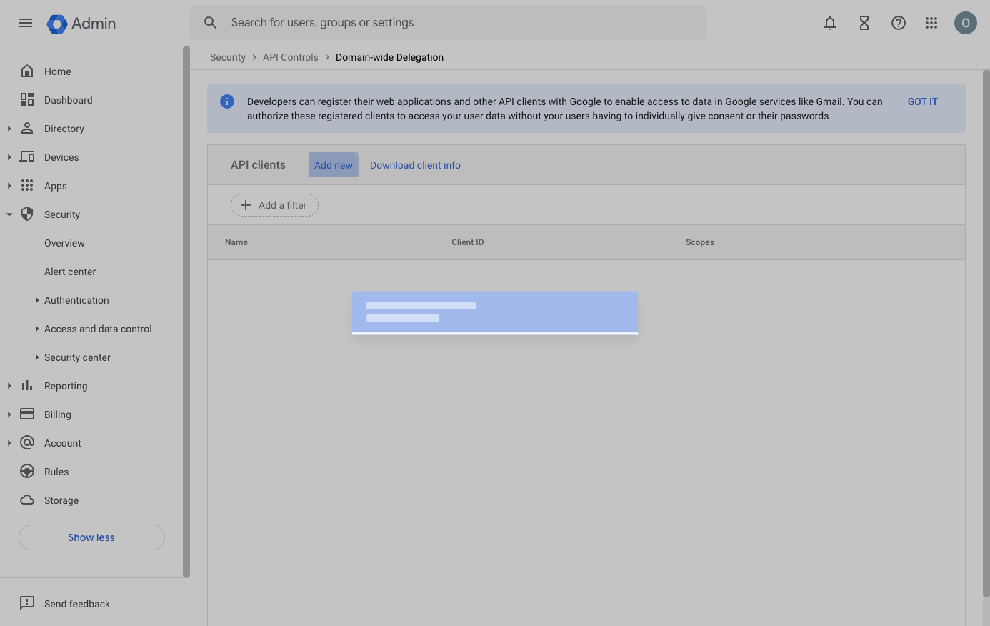 - Go to Google Admin Console > Security > API Controls > Domain-wide Delegation