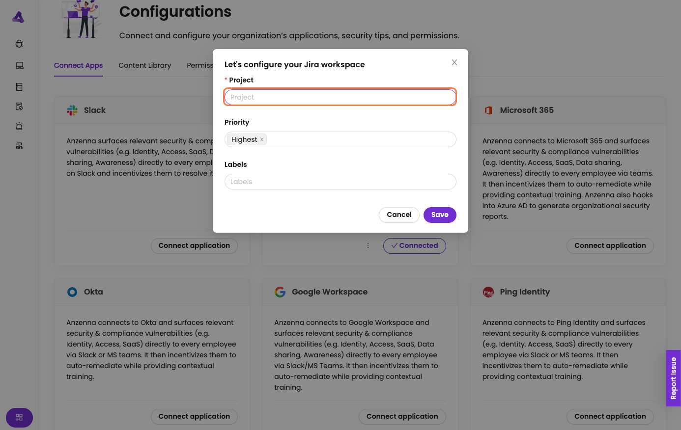 Integrate Anzenna with JIRA to monitor projects, issues, priorities, and labels across your Atlassian workspace.