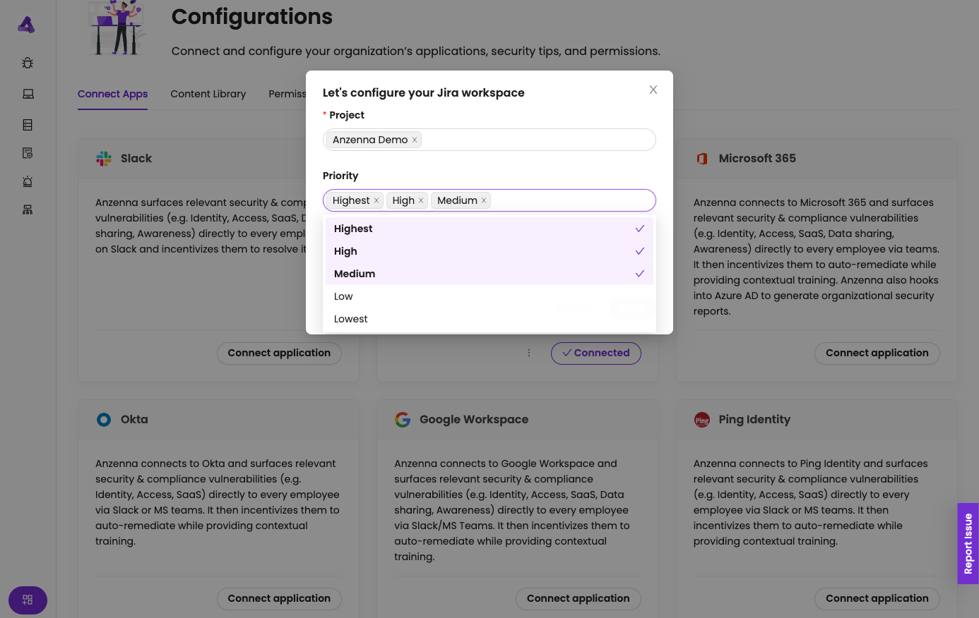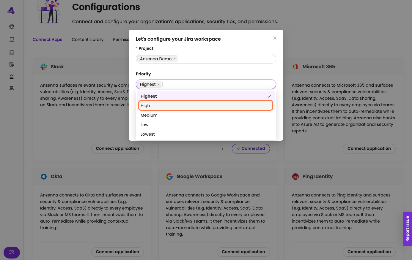 Anzenna is now connected to JIRA and will begin monitoring your selected projects, priorities, and labels.