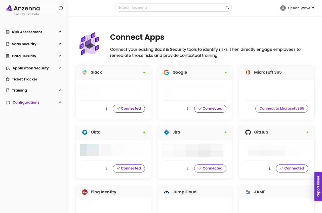 Integrate Anzenna with Microsoft 365 to monitor users, devices, applications, and activity. Optionally enable password reset, app uninstall, activity monitoring, and Defender Live Response capabilities.