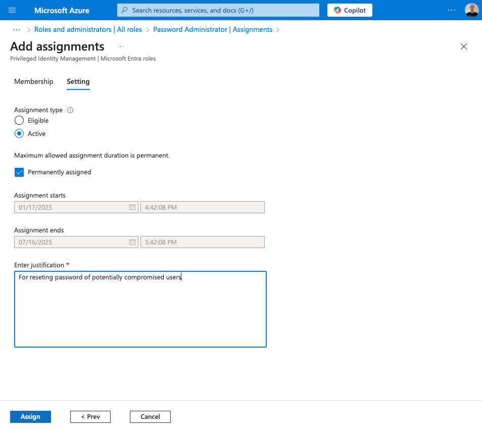 - Enter a justification such as "For resetting password of potentially compromised users." then click Assign.
