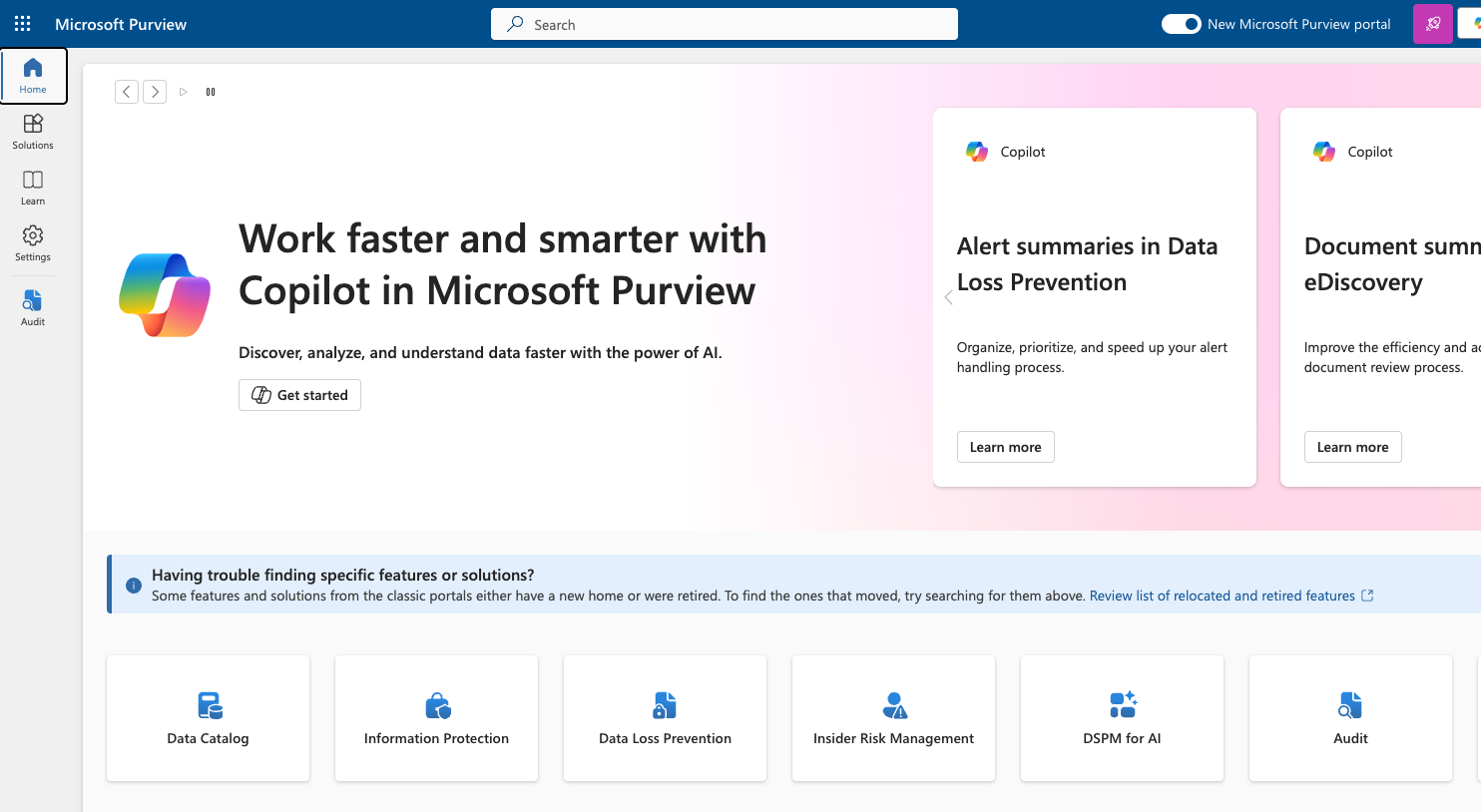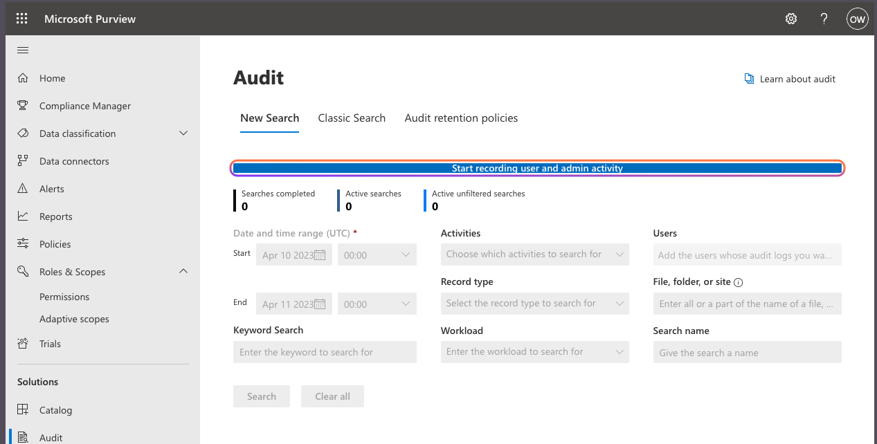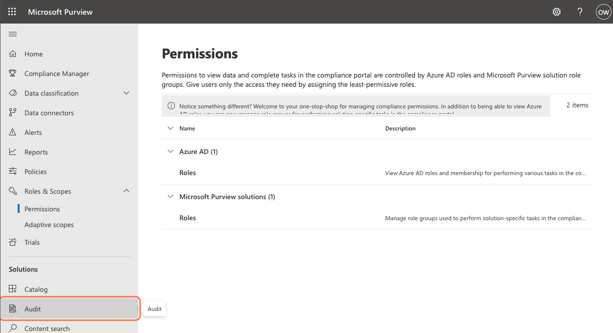 - Go to purview.microsoft.com and click on Audit.