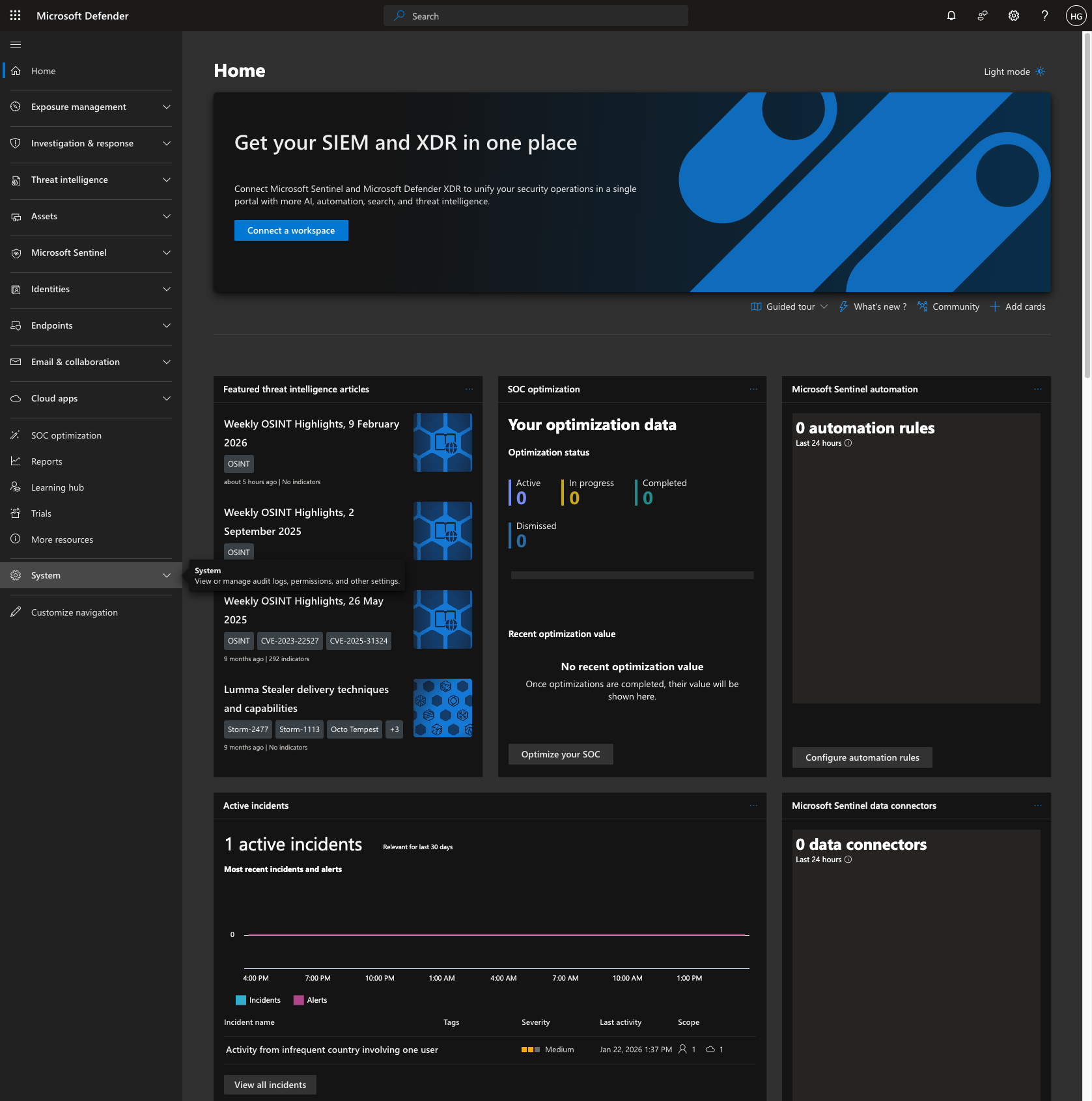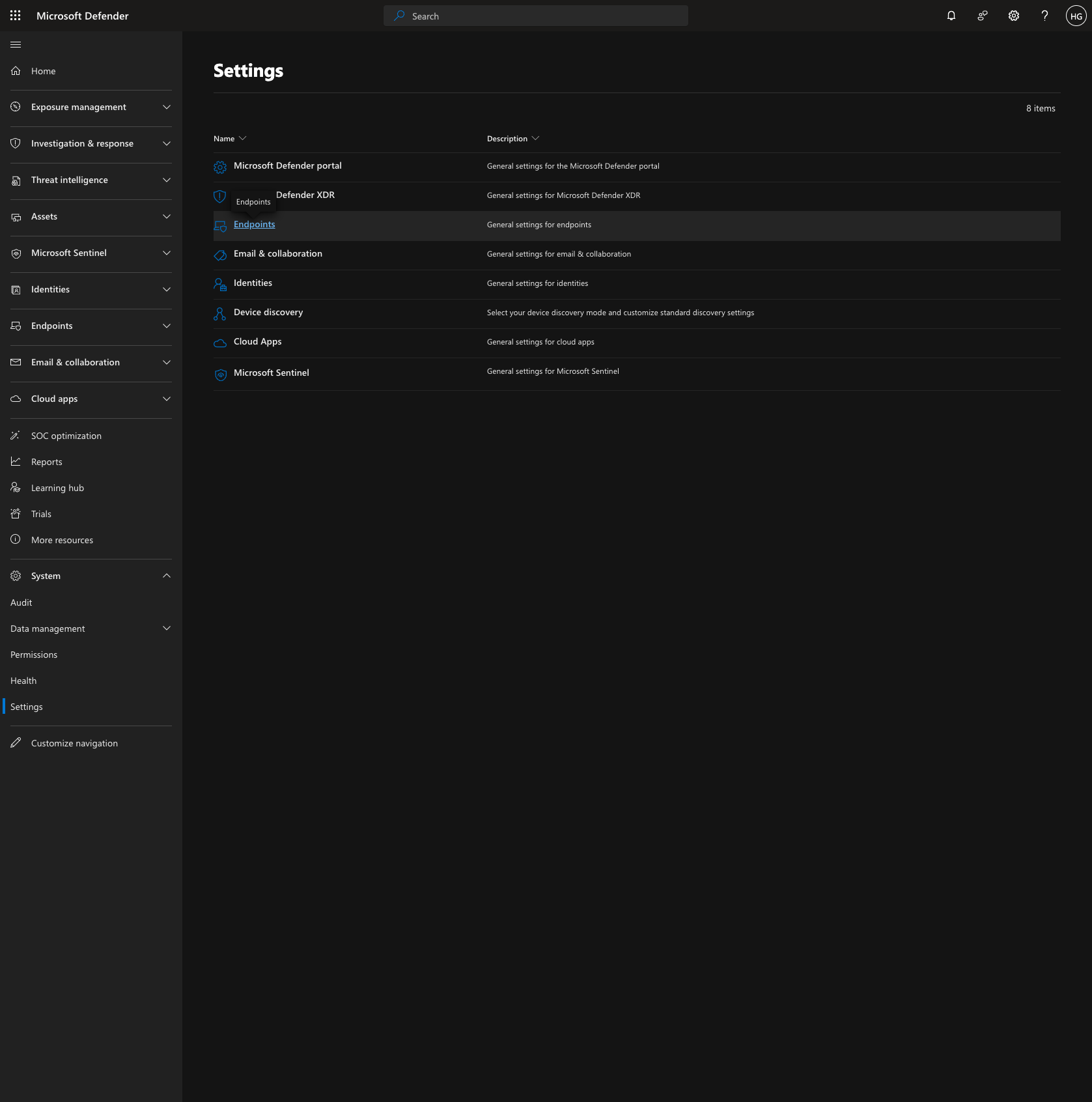 - Go to security.microsoft.com and click on System.