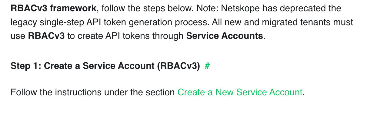 - In Netskope, create a Service Account using RBACv3. Follow the steps below. Note: Netskope has deprecated the old API token generation process — all new and migrated tenants must create API tokens through Service Accounts.