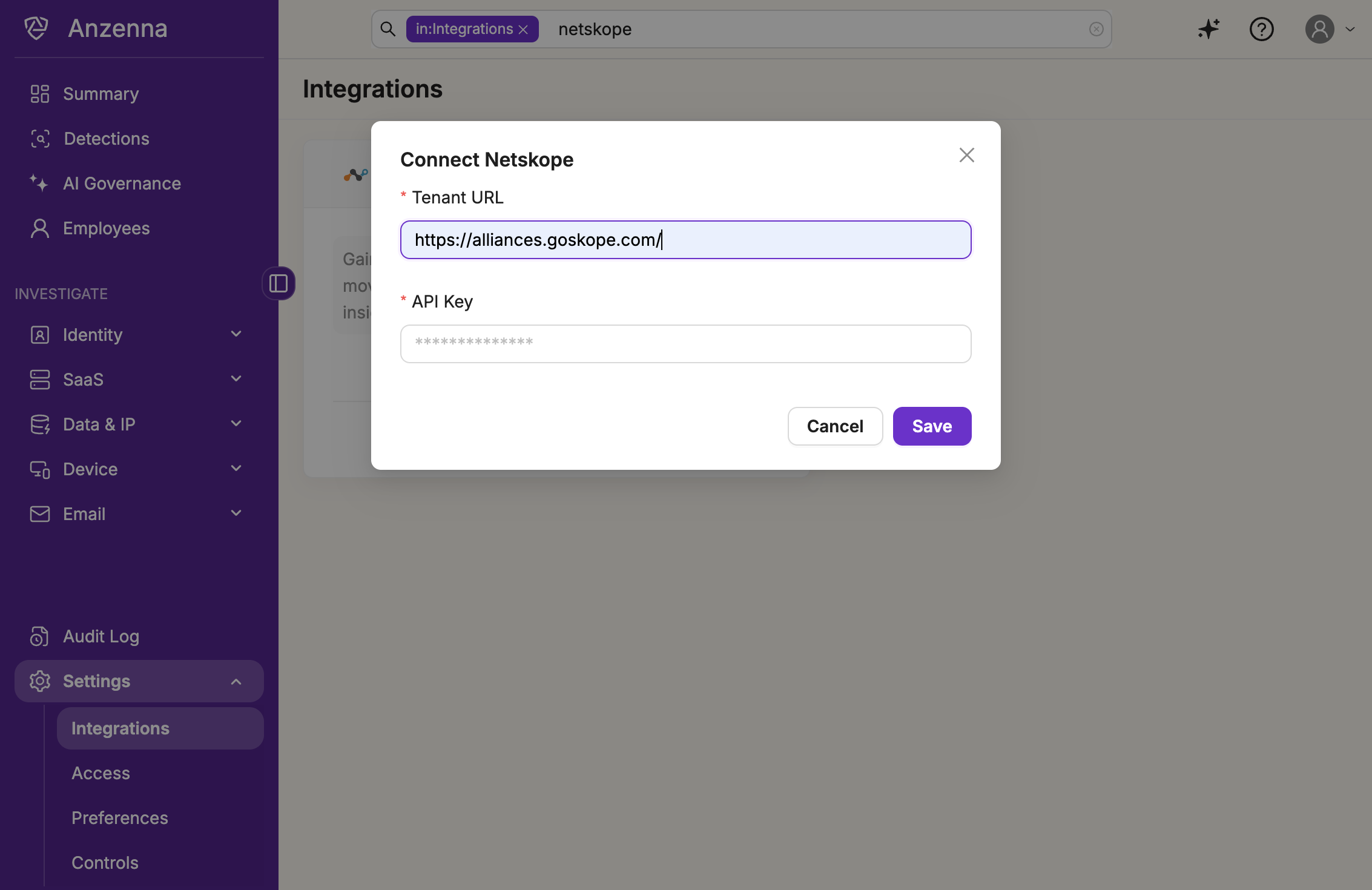 - In Anzenna, go to Settings > Integrations and search for Netskope.