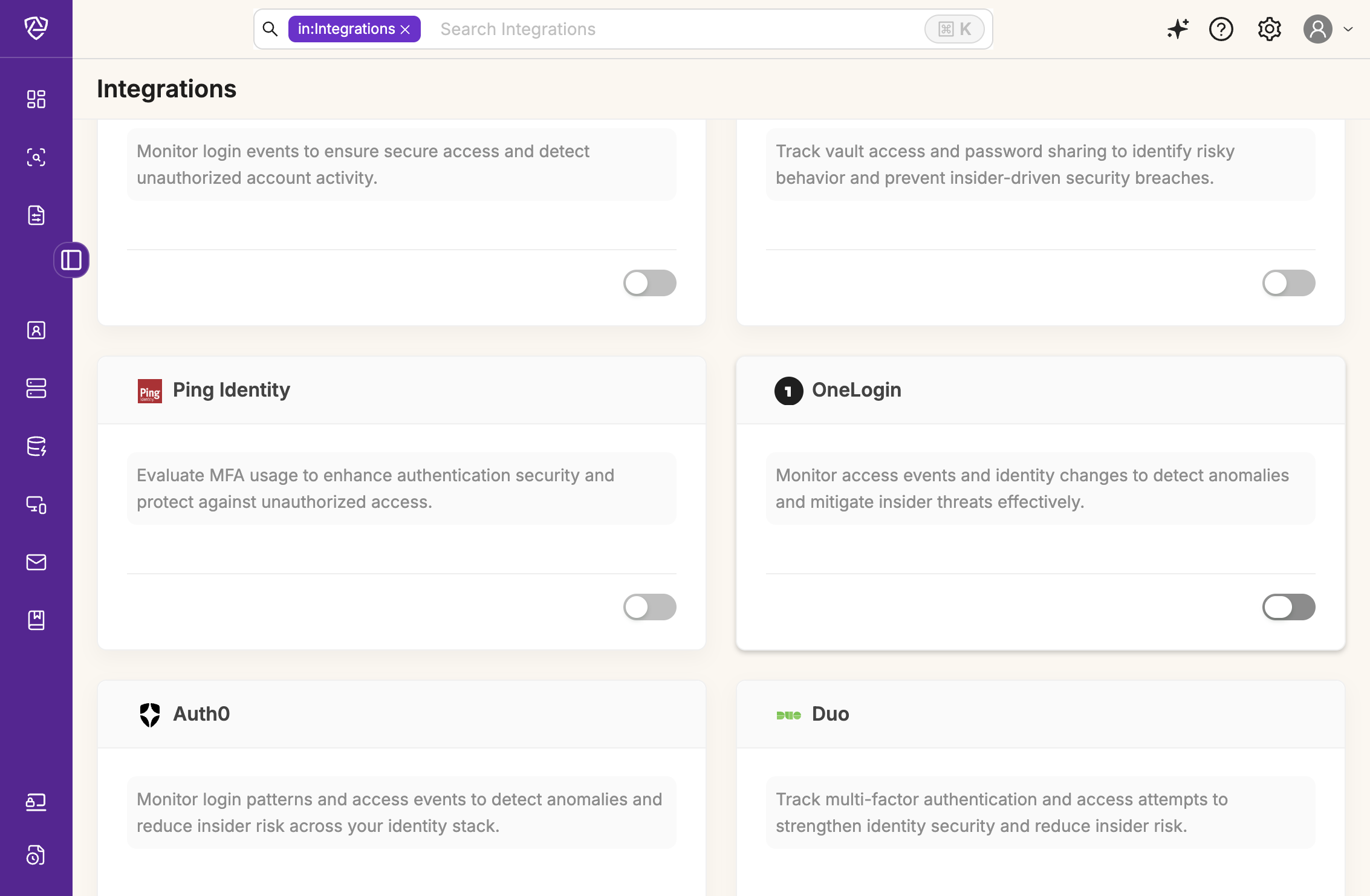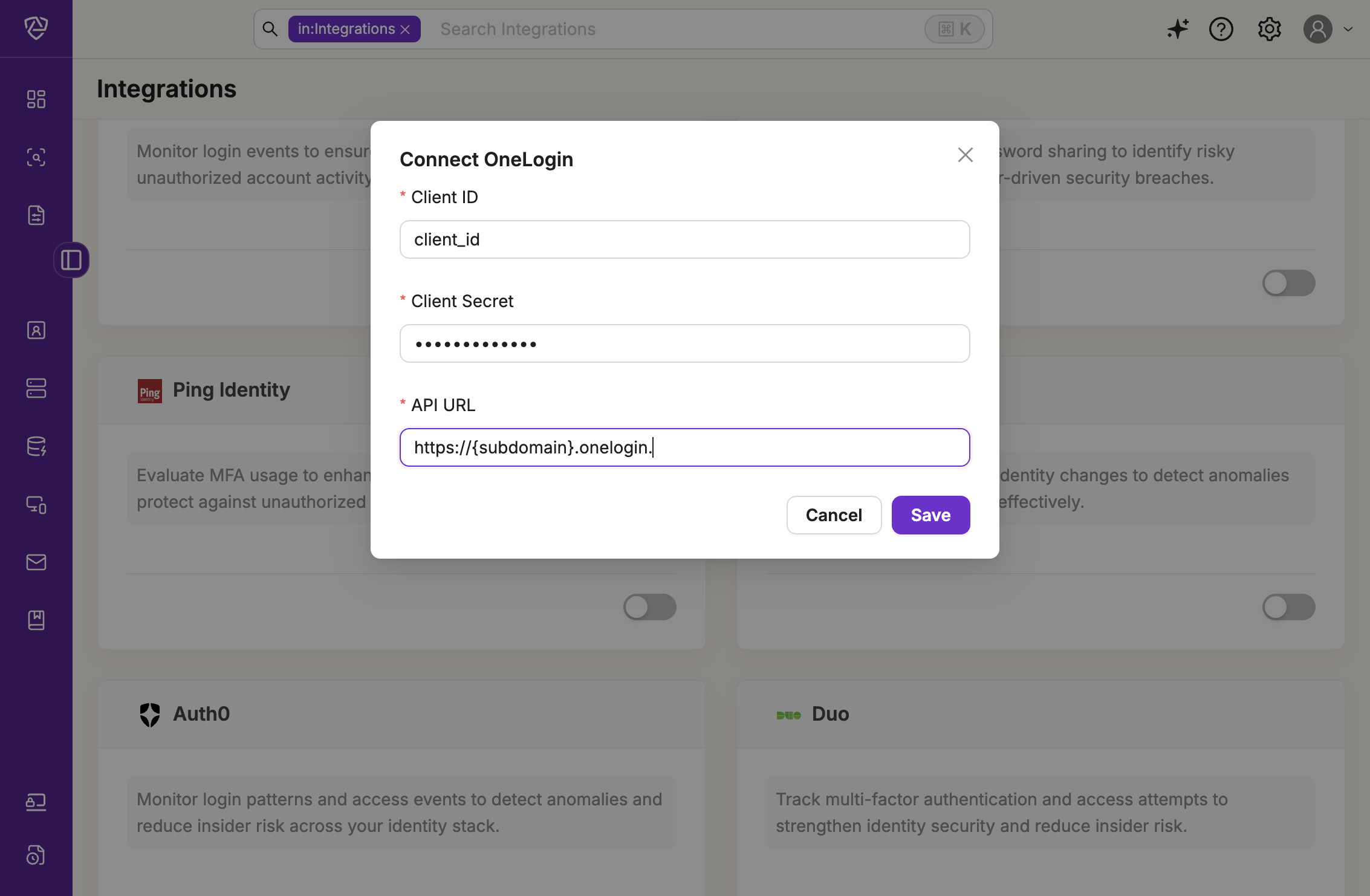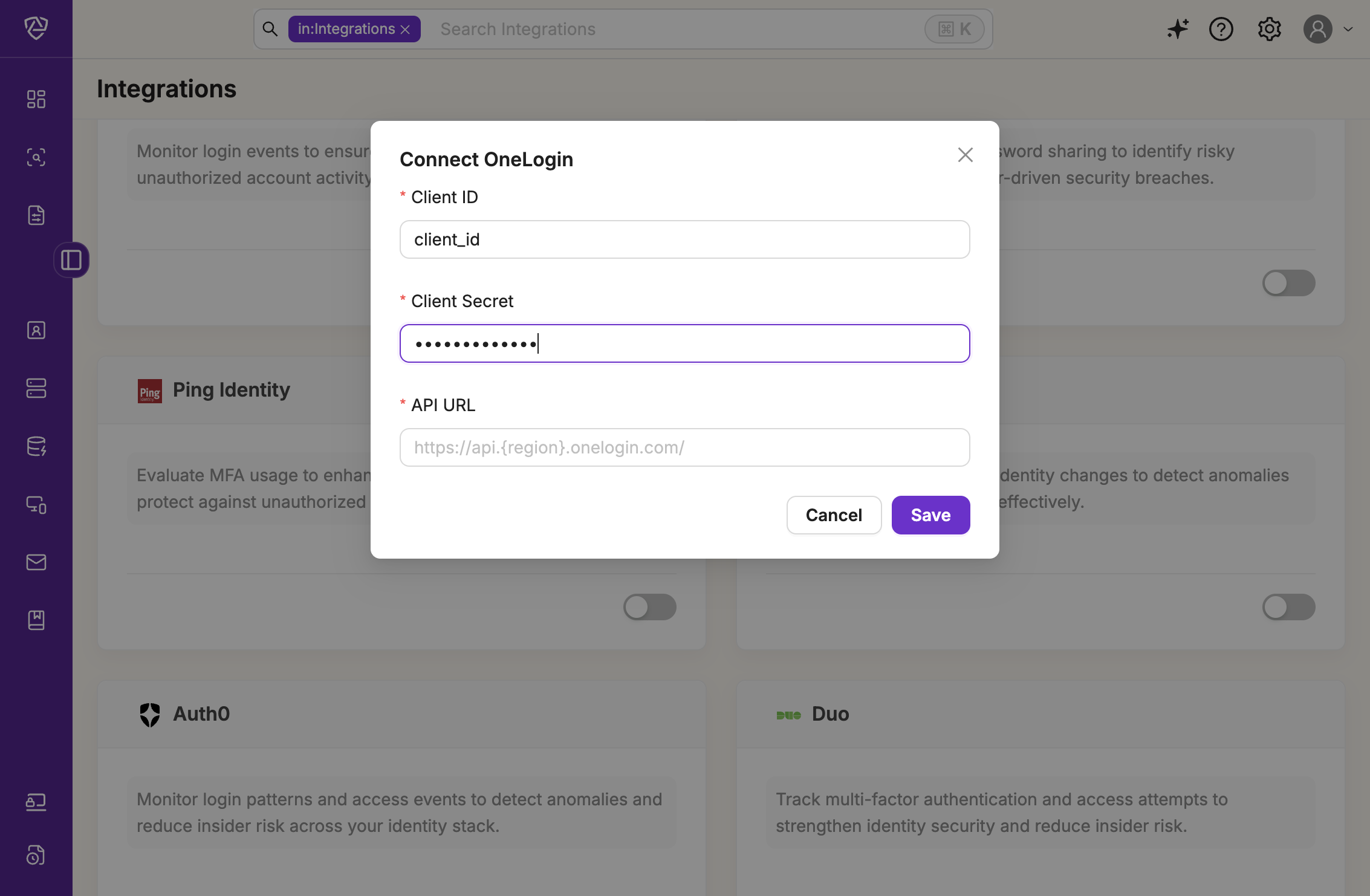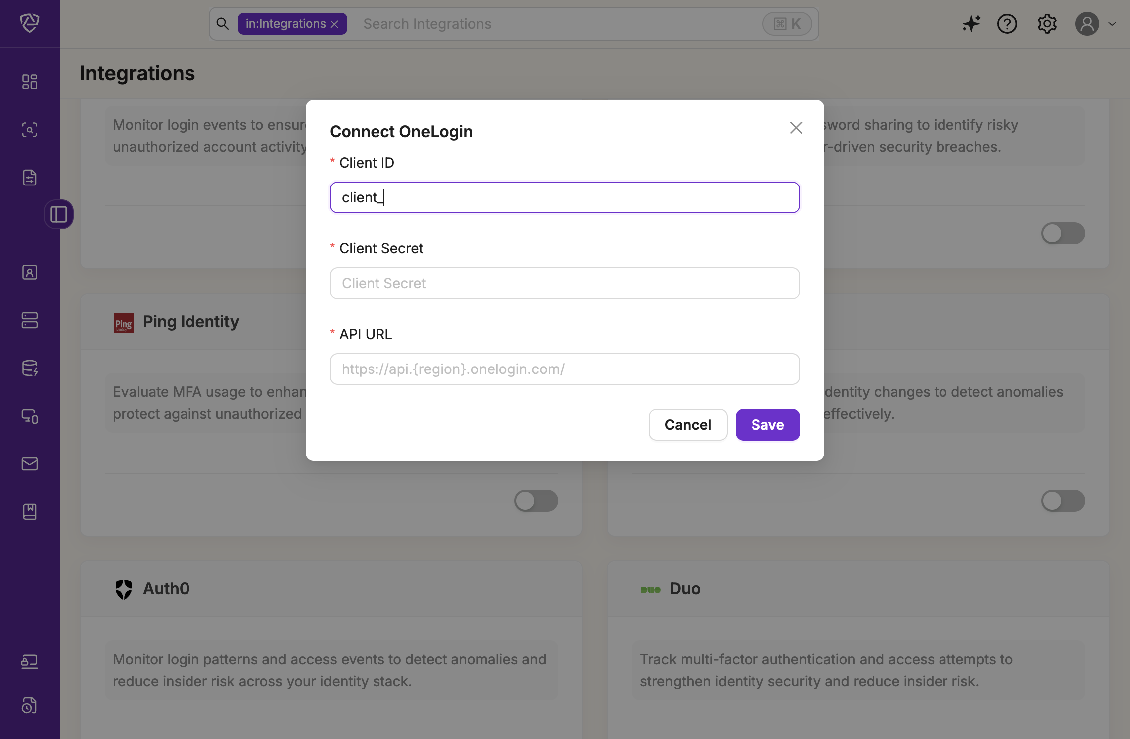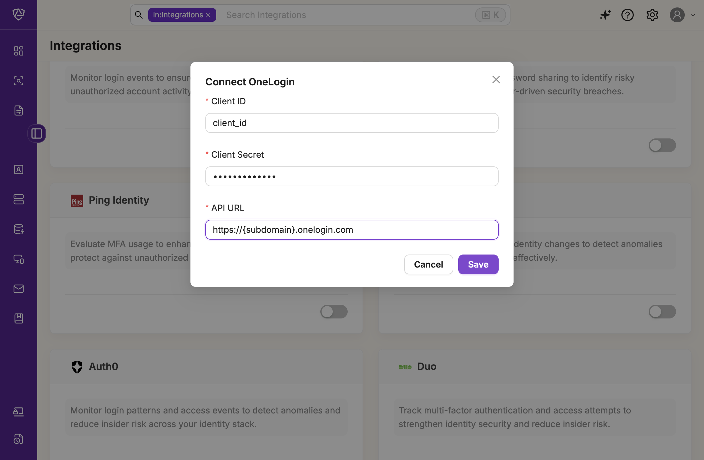 Integrate Anzenna with OneLogin to monitor users, groups, roles, and access activity across your organization.