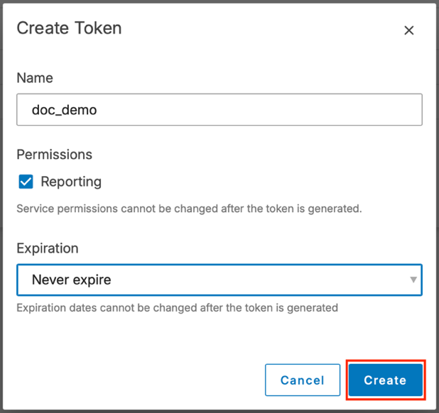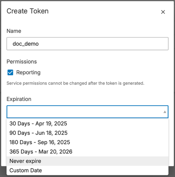 - Expiration — Select Never expire (recommended). Note: permissions and expiration cannot be changed after the token is generated.