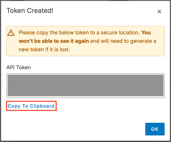 You won't be able to view the token again after closing this dialog. Save it in a secure location.