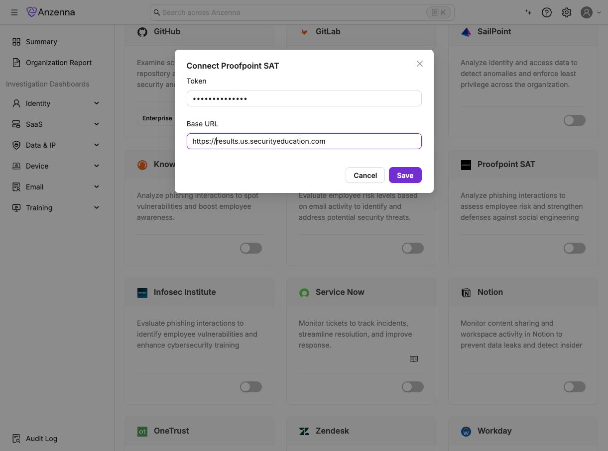 Integrate Anzenna with Proofpoint ZenGuide (formerly Proofpoint Security Awareness Training) to monitor phishing simulation results and training completion across your organization. ZenGuide enables security teams to automate personalized learning paths based on an individual's unique risk profile, behaviors, and role.