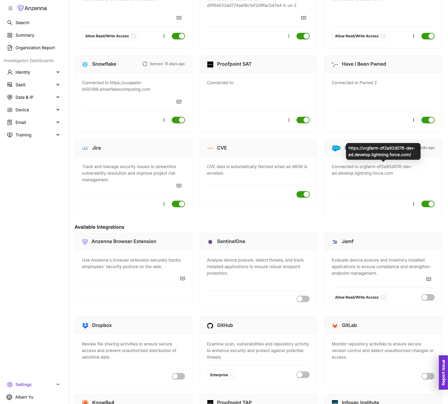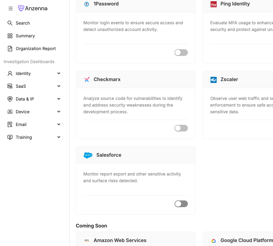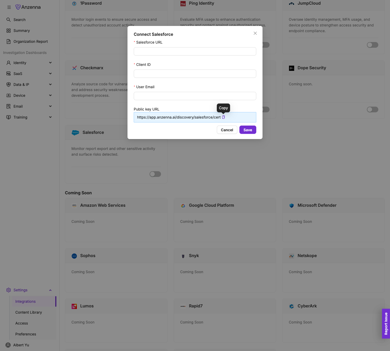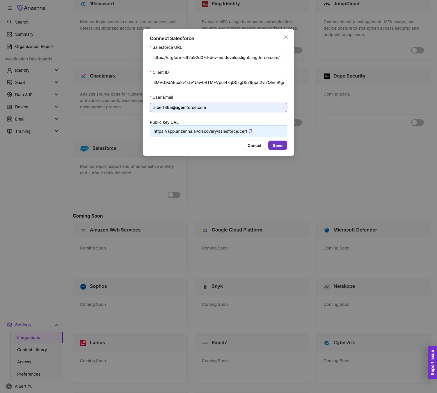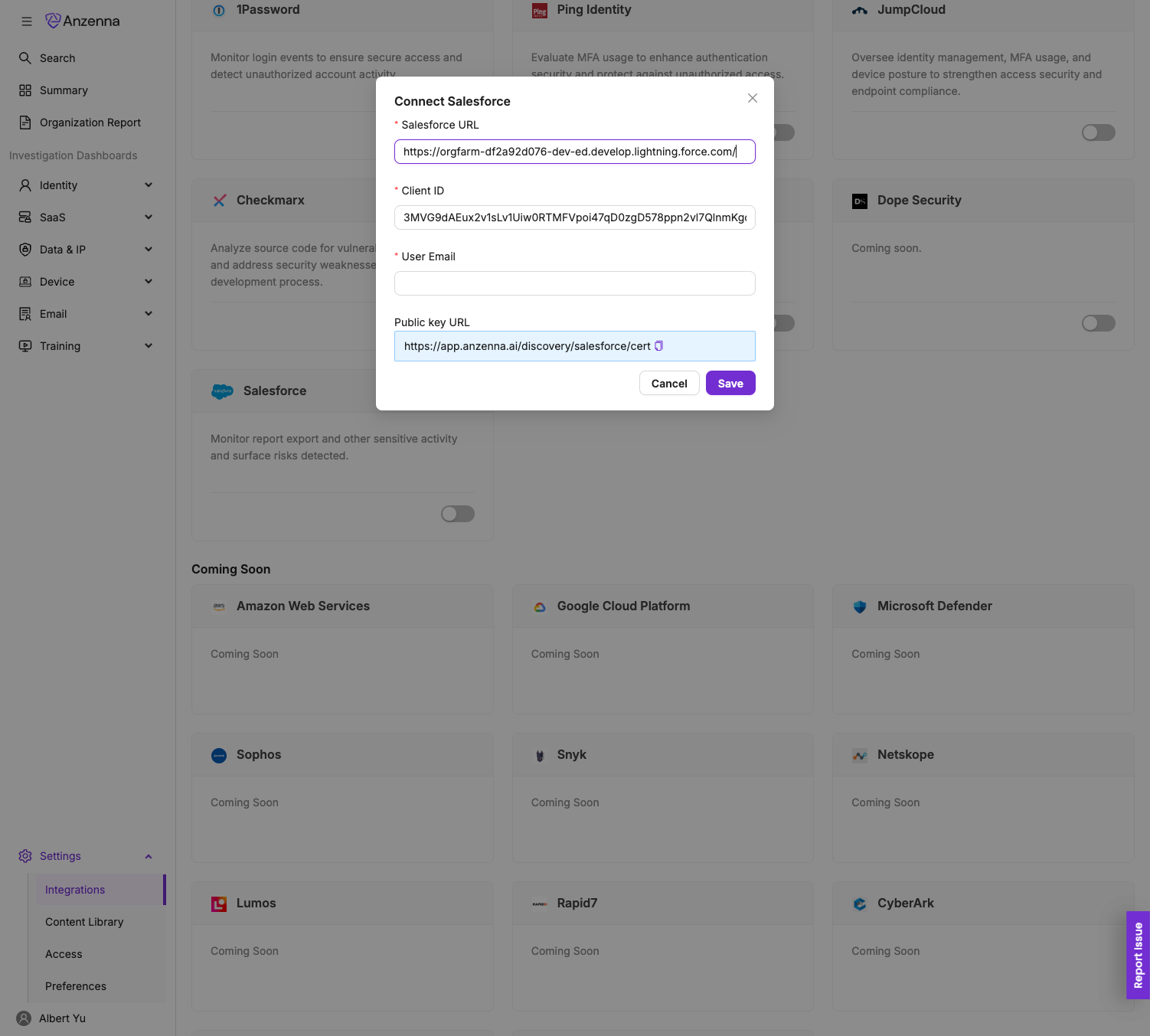 Your Salesforce integration is now active. Anzenna will begin collecting event logs for security monitoring.