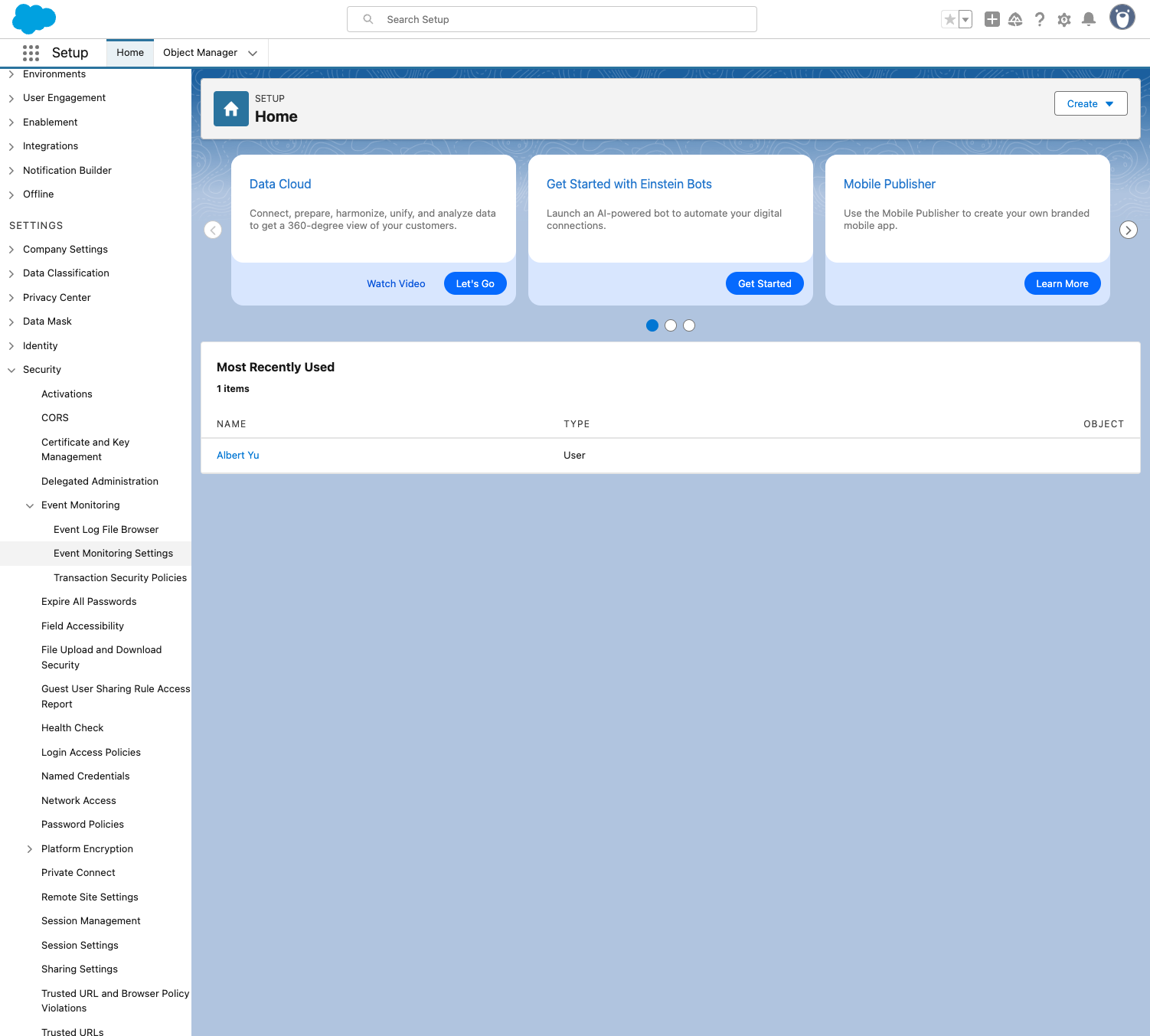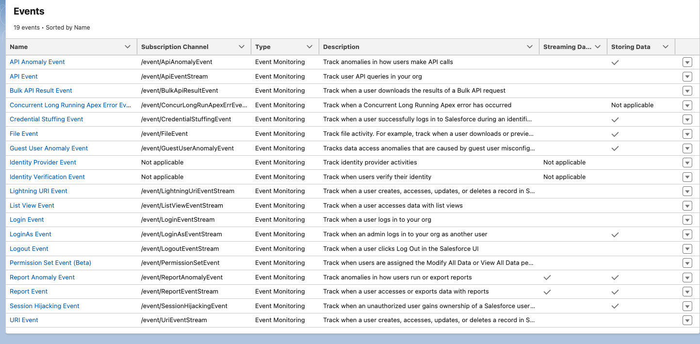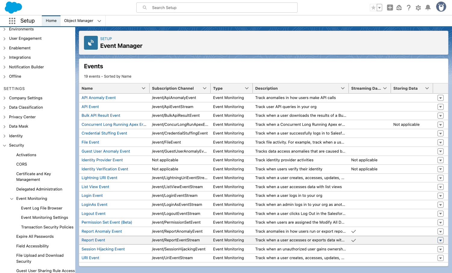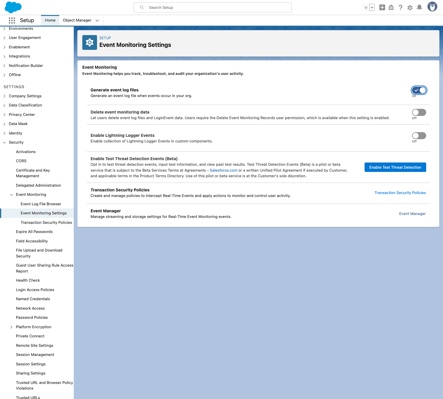 - Salesforce Shield or Event Monitoring add-on (required for event log access)