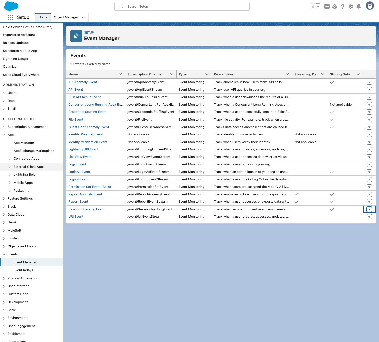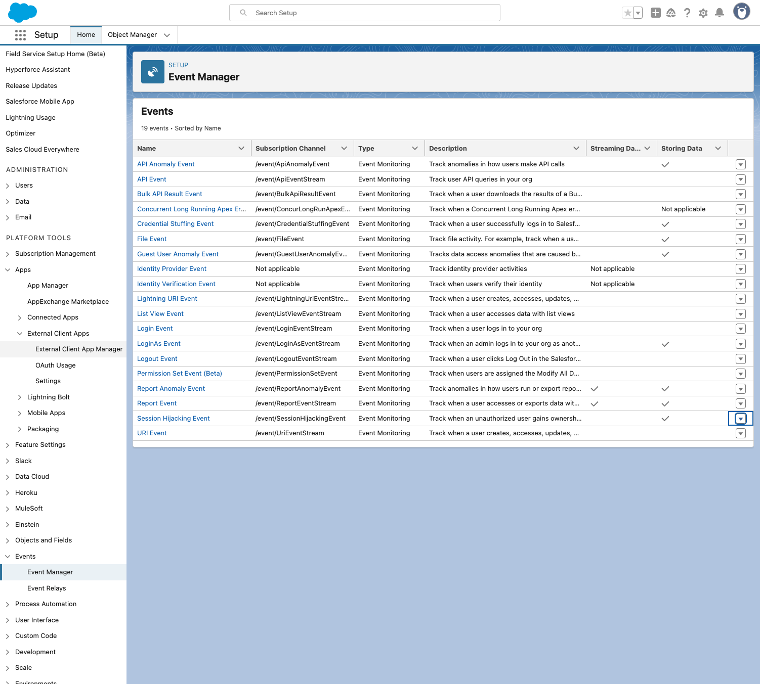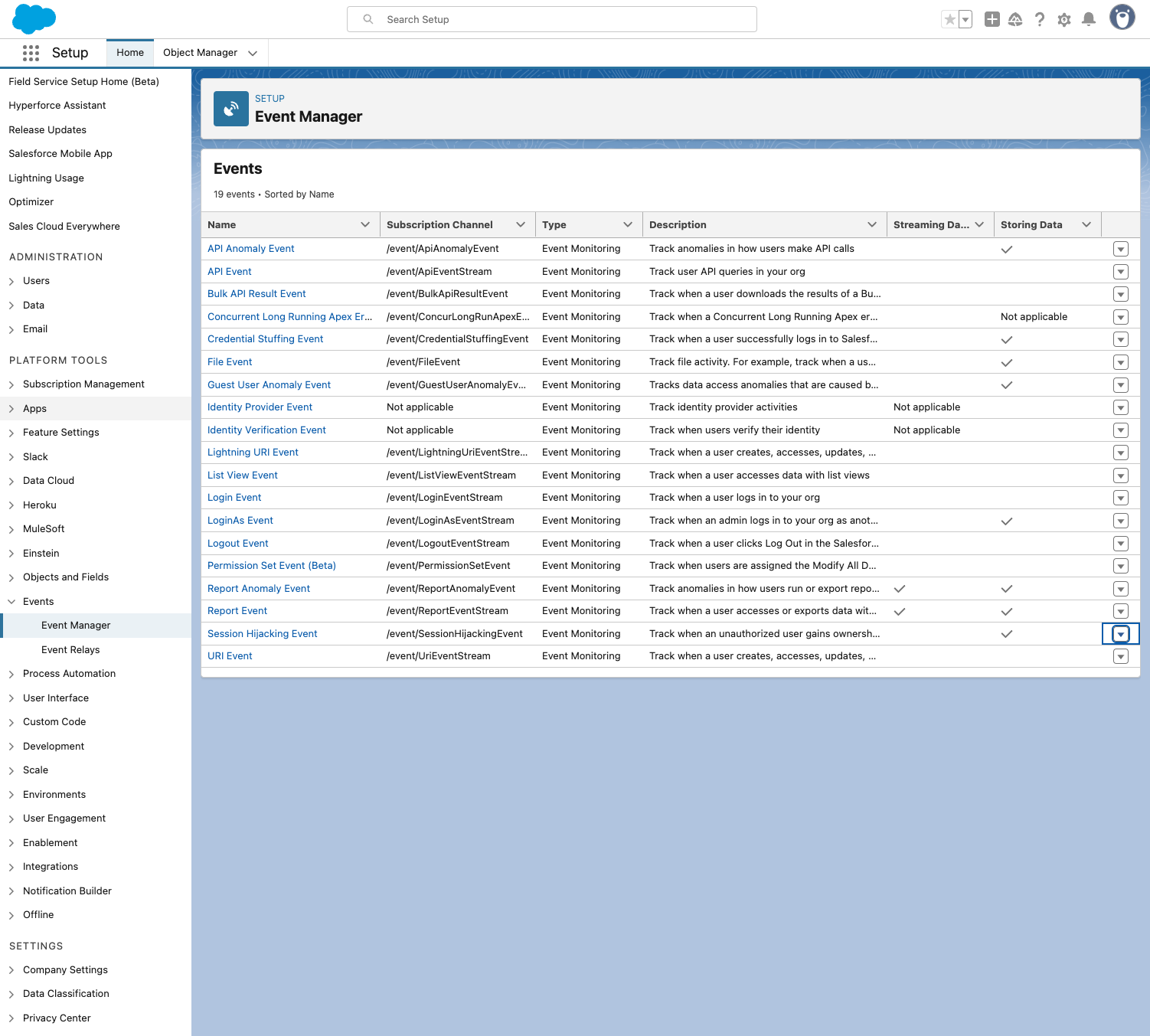 - Salesforce Shield or Event Monitoring add-on (required for event log access)