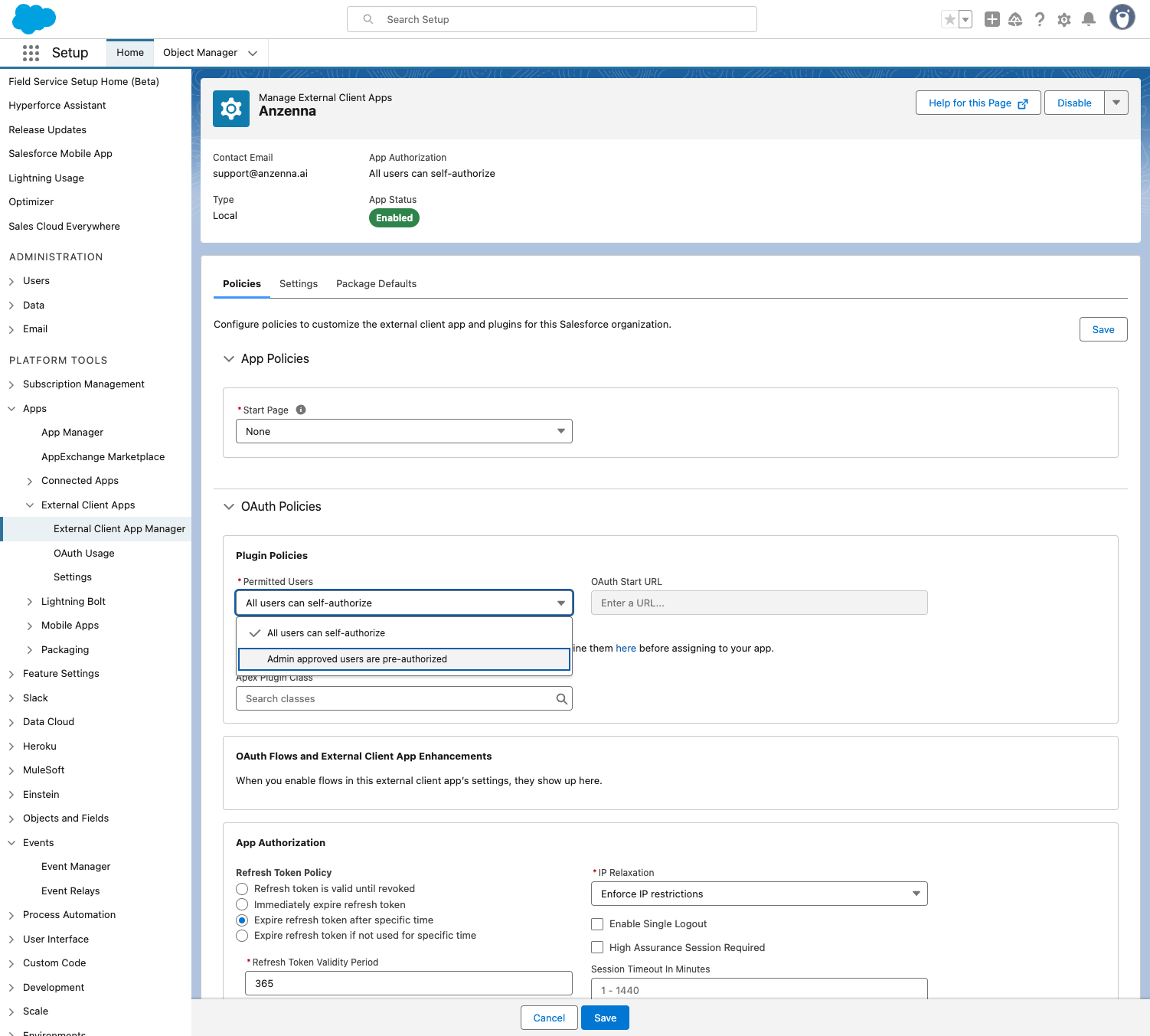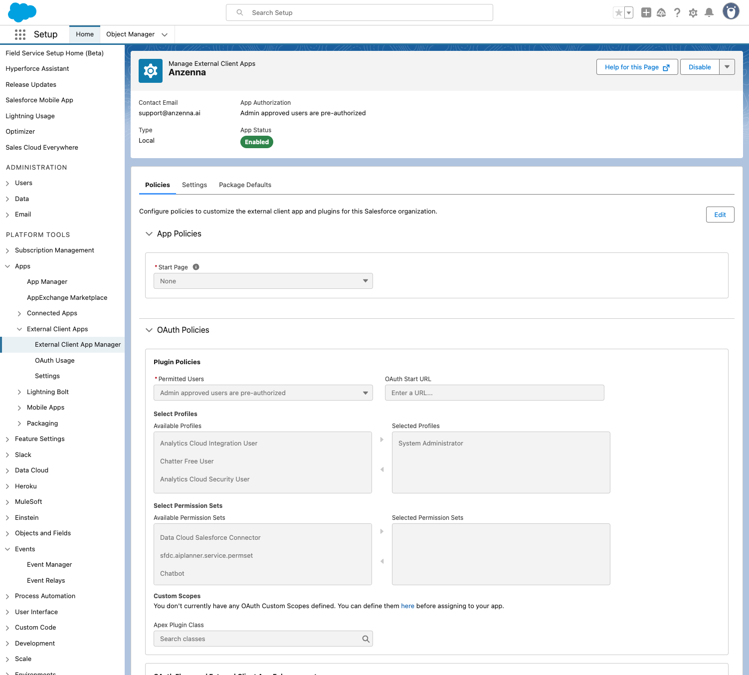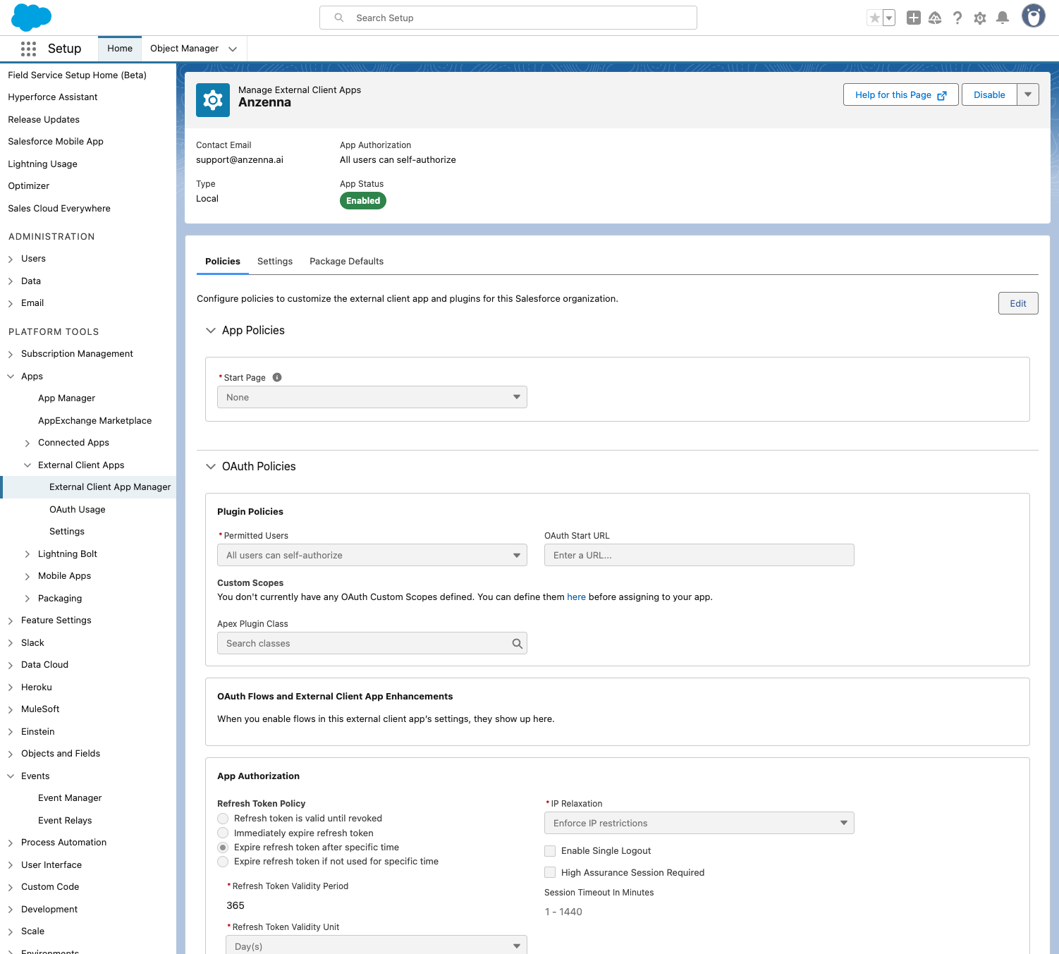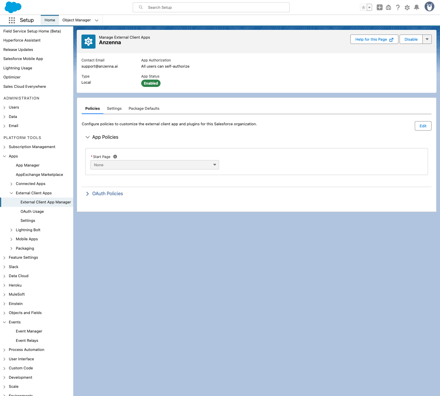This guide walks you through connecting your Salesforce instance to Anzenna. The integration enables Anzenna to collect Salesforce event logs for security monitoring, anomaly detection, and compliance visibility.