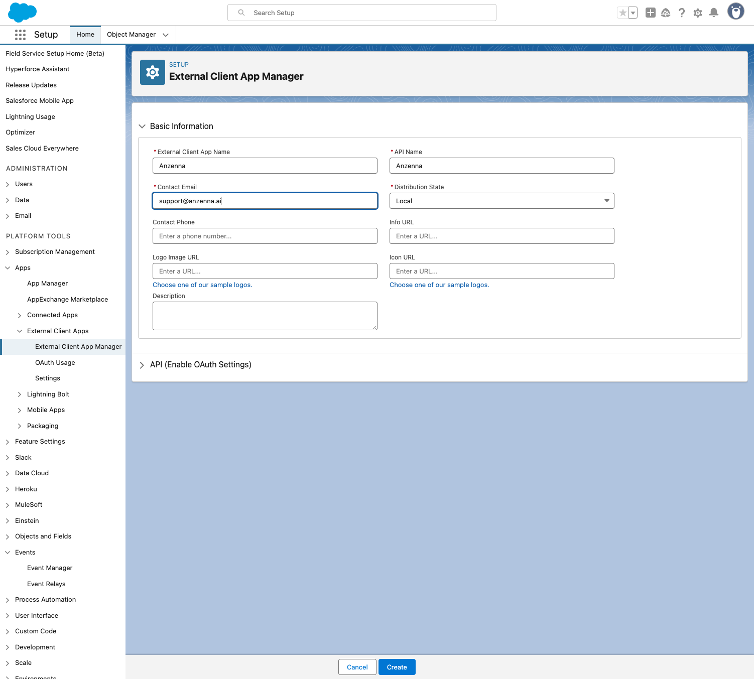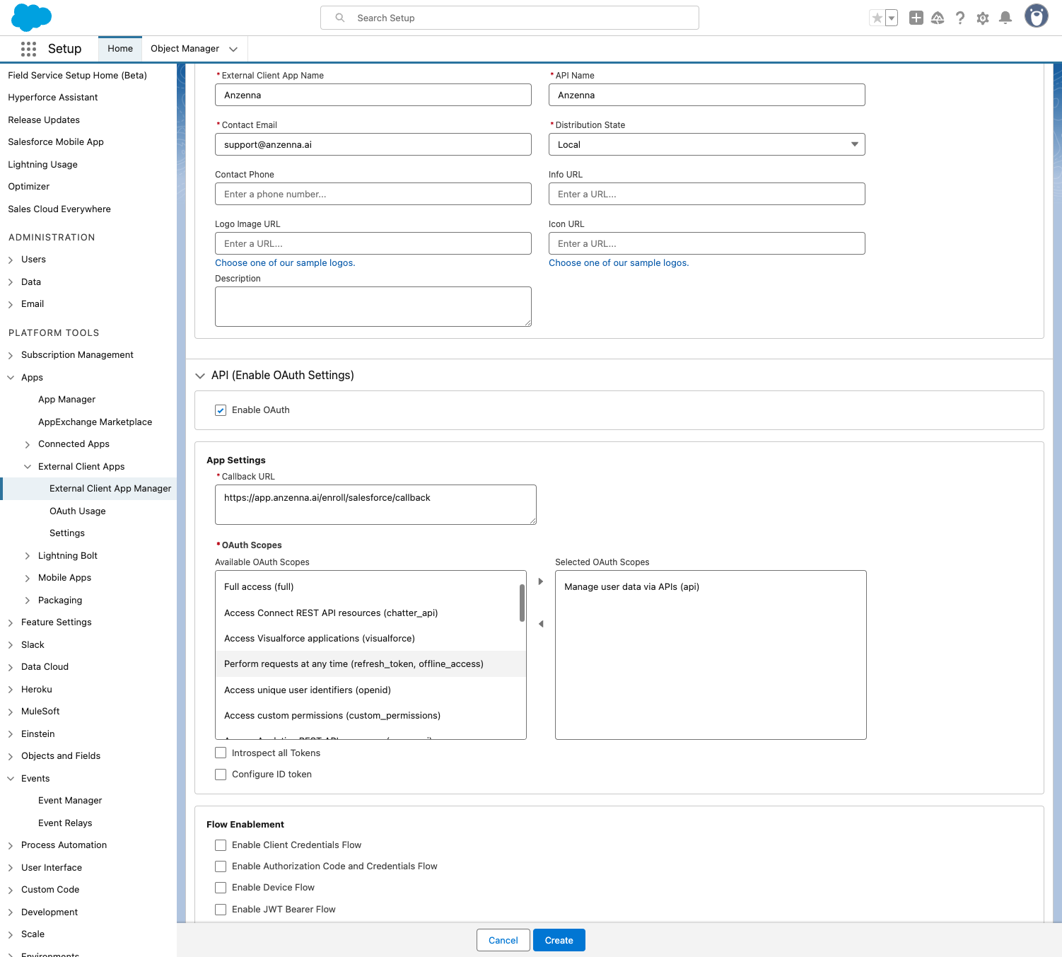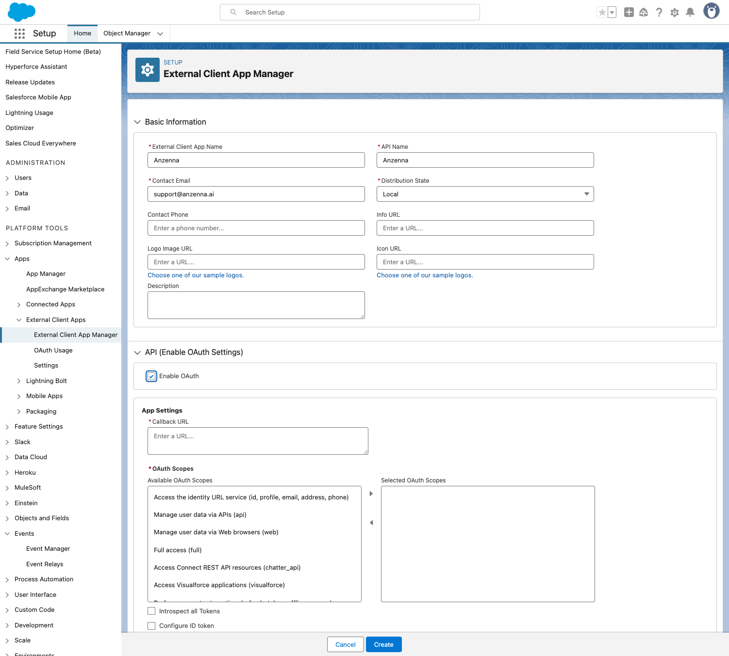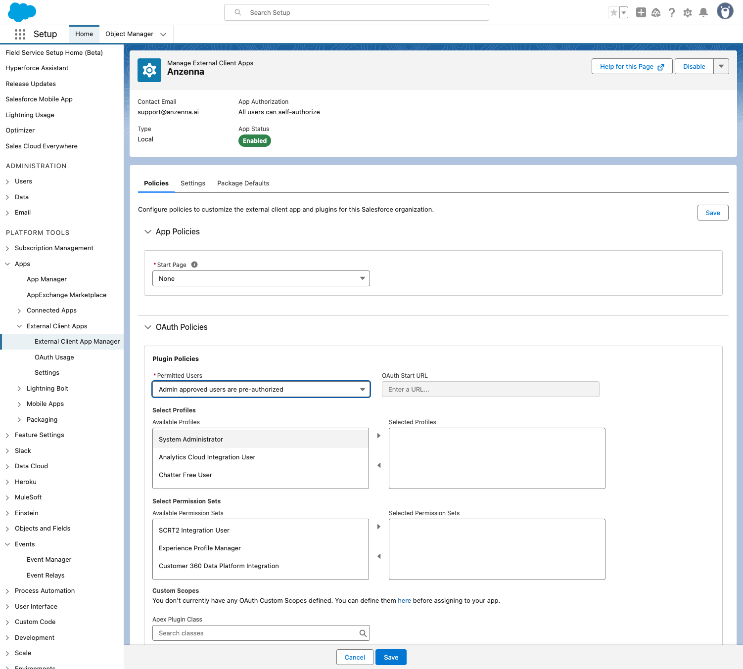 This guide walks you through connecting your Salesforce instance to Anzenna. The integration enables Anzenna to collect Salesforce event logs for security monitoring, anomaly detection, and compliance visibility.