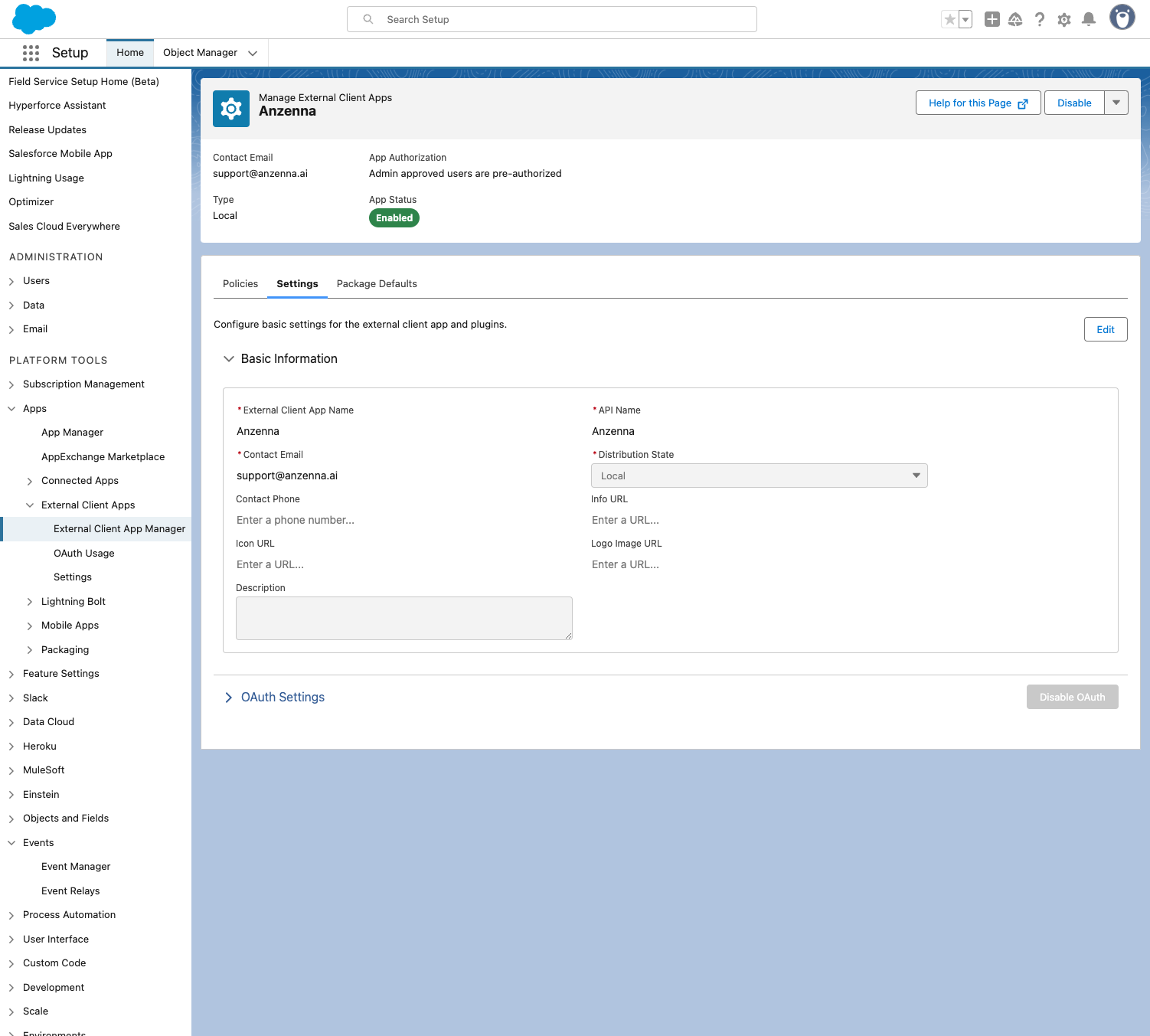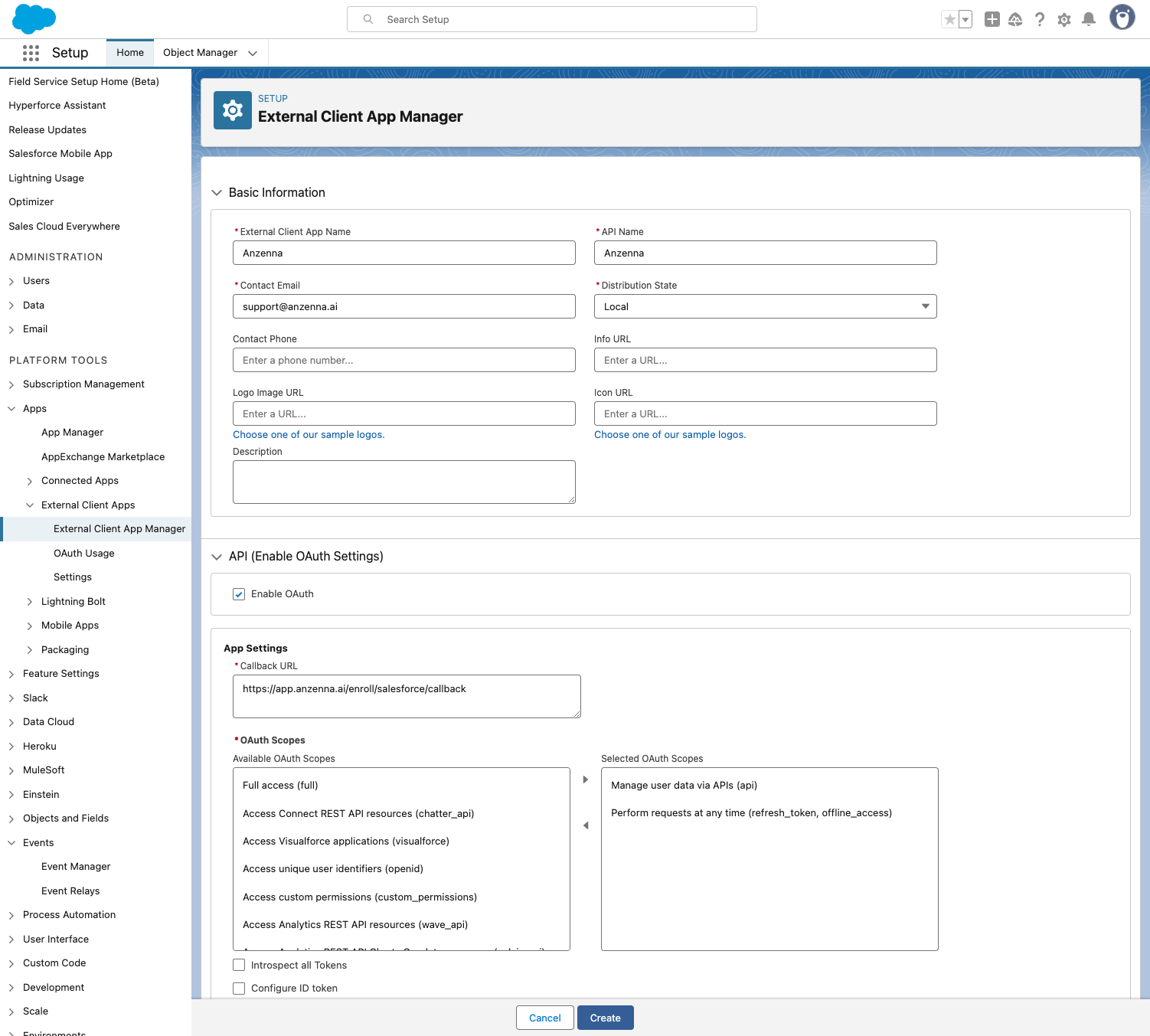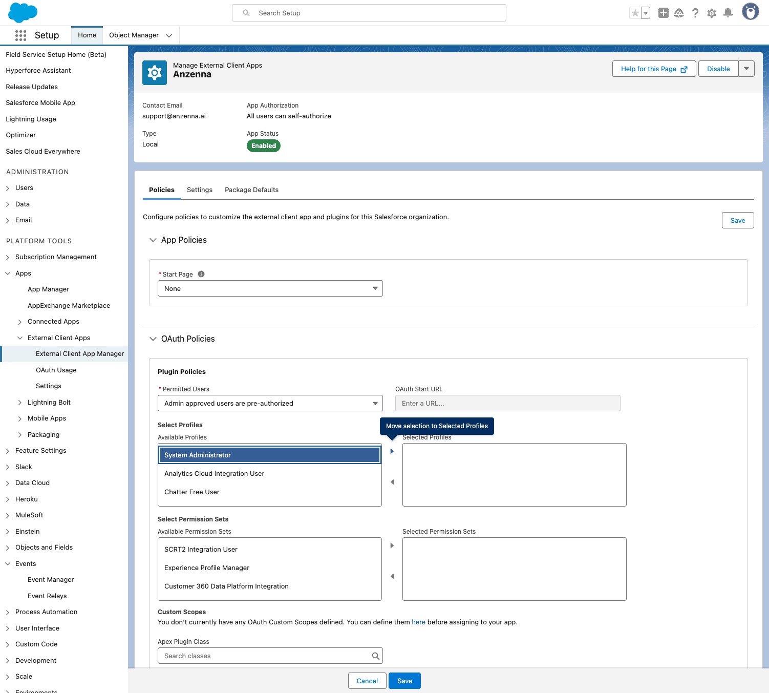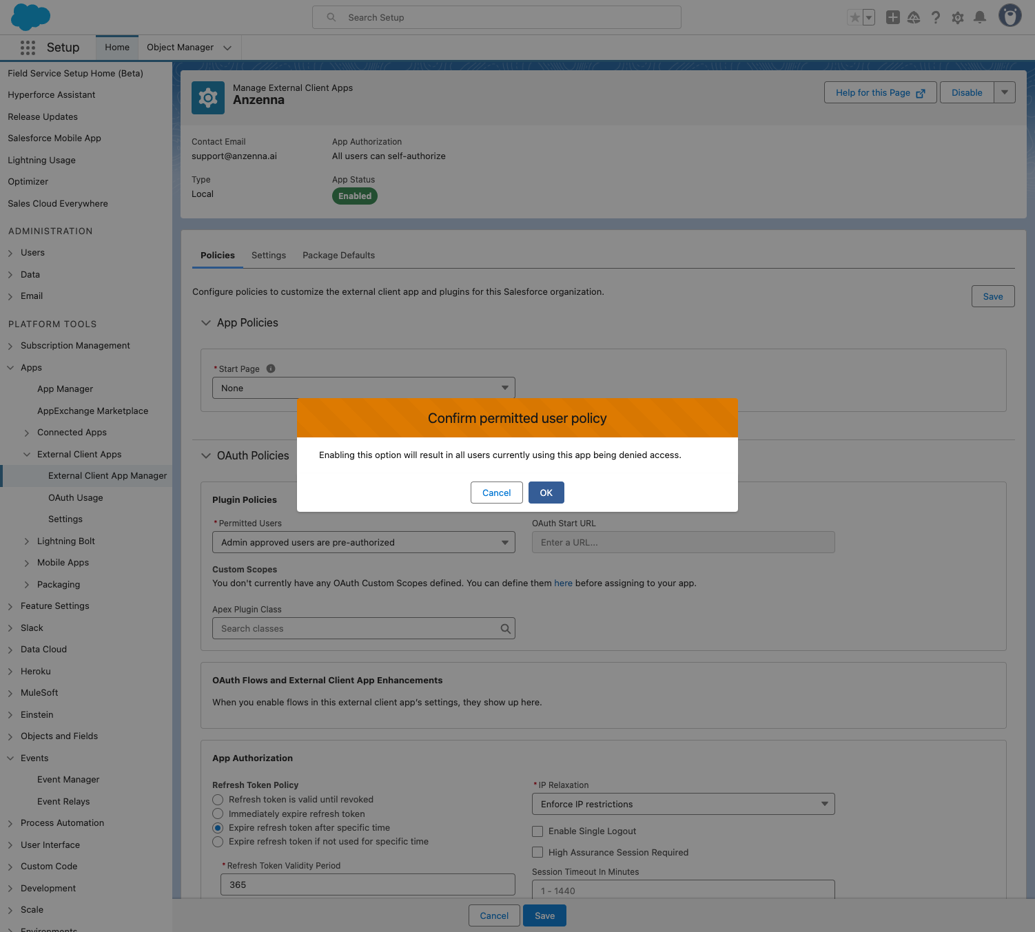 This guide walks you through connecting your Salesforce instance to Anzenna. The integration enables Anzenna to collect Salesforce event logs for security monitoring, anomaly detection, and compliance visibility.