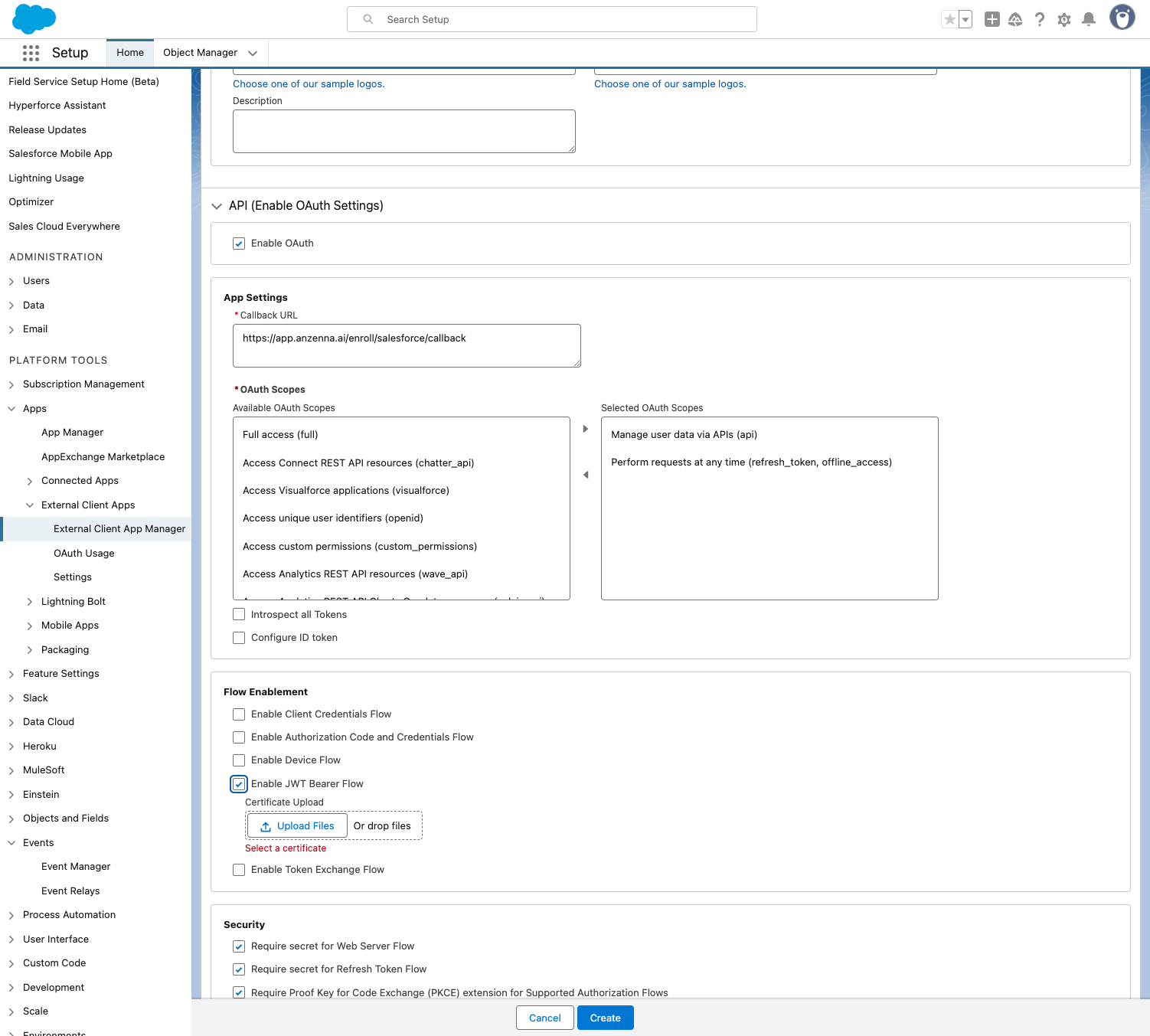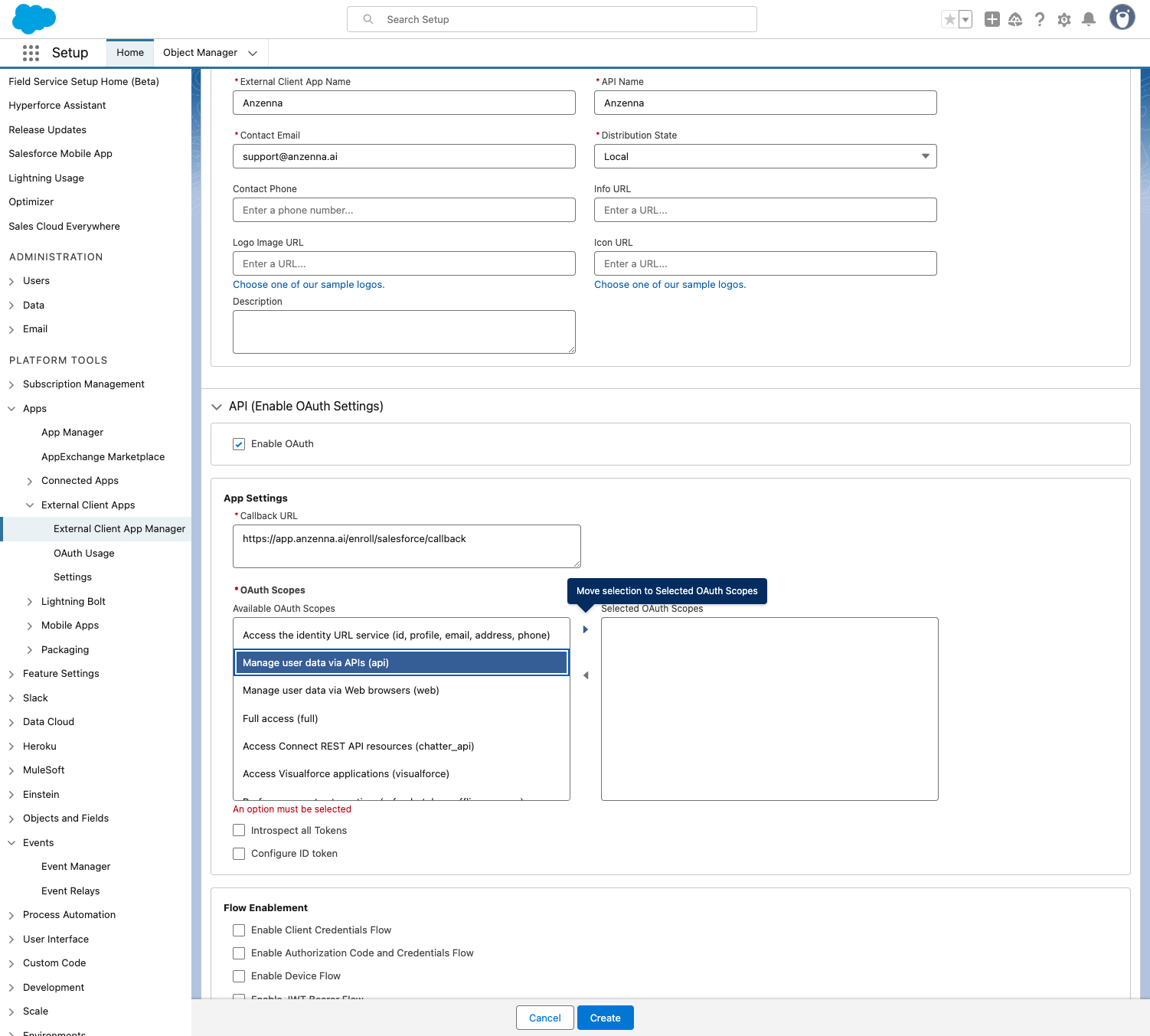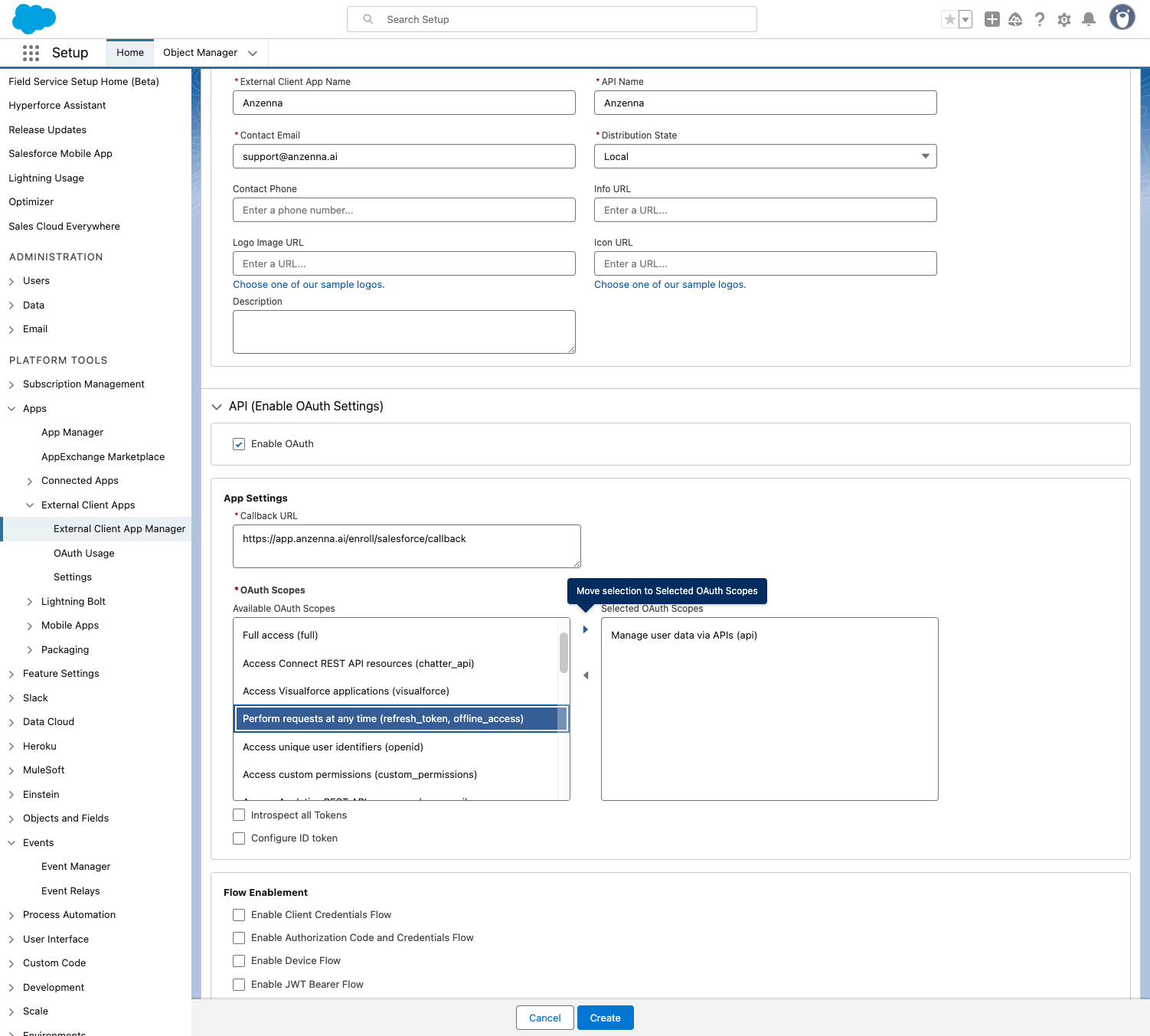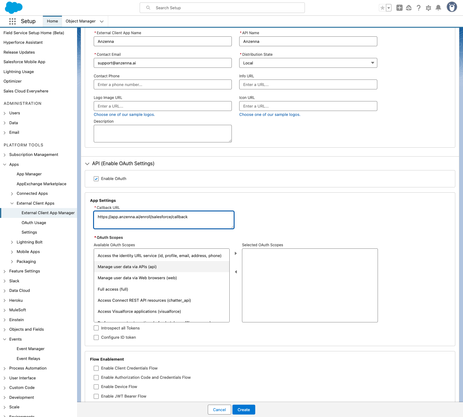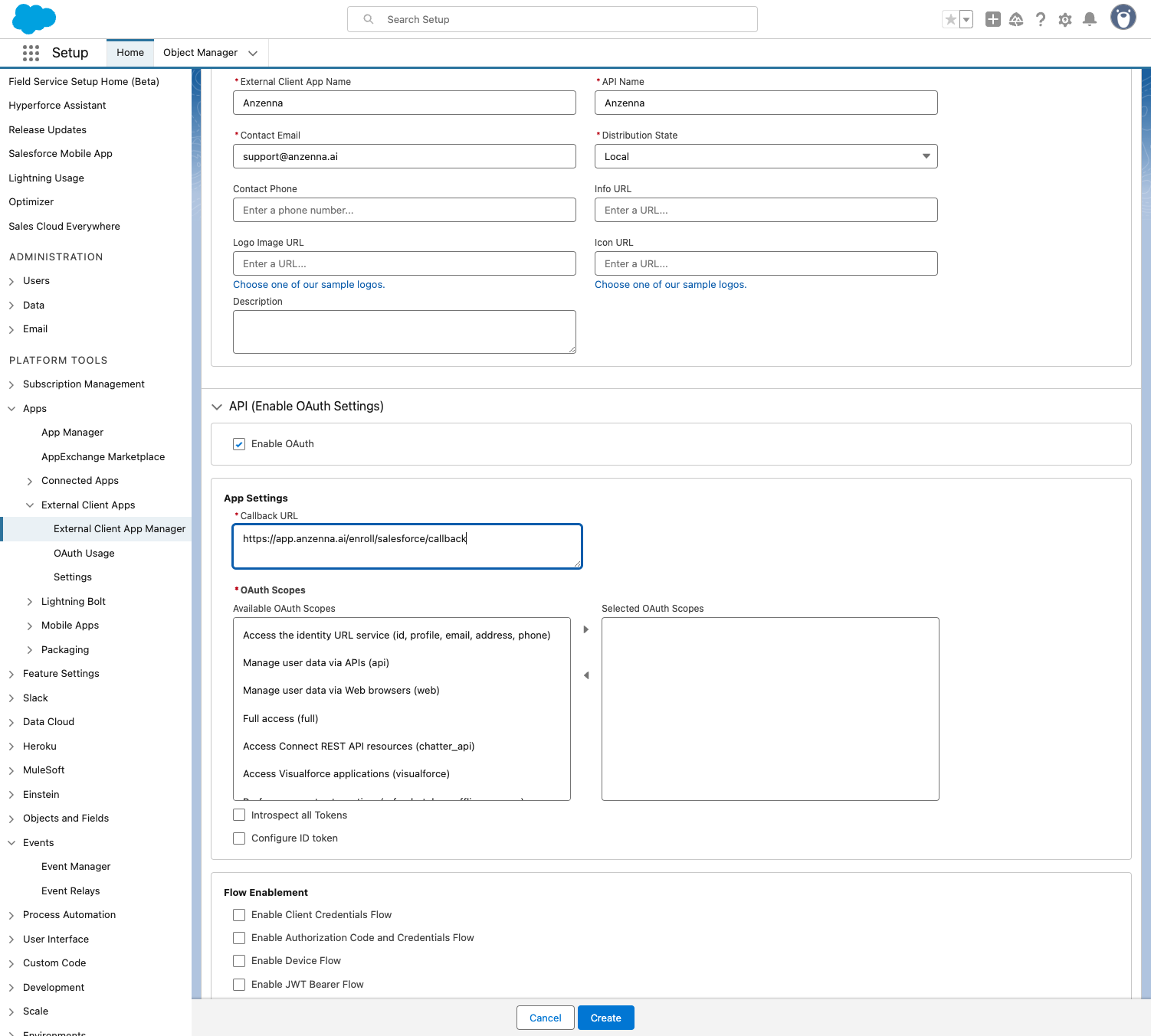 https://app.anzenna.ai/enroll/salesforce/callbackinto the text area.
