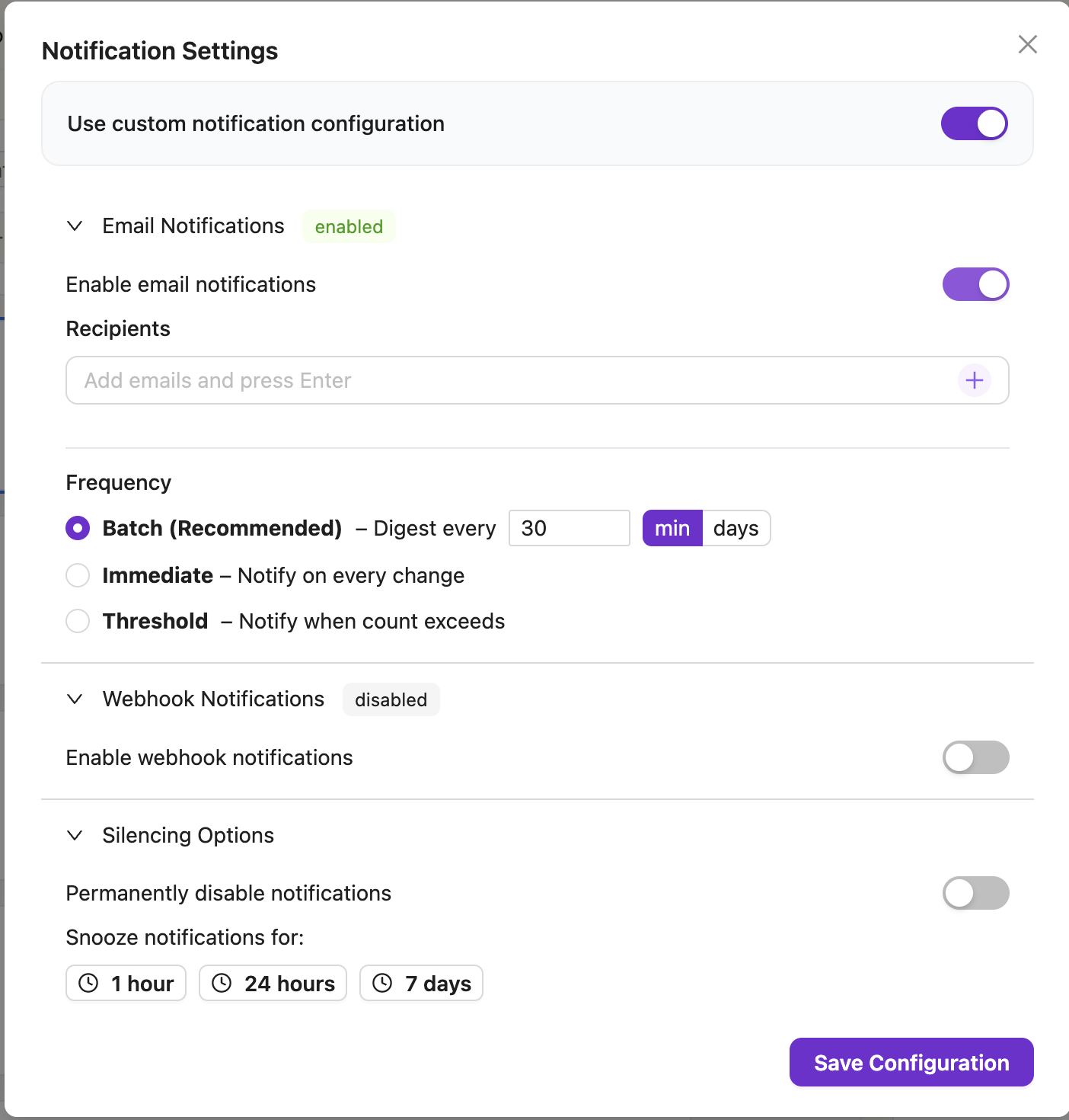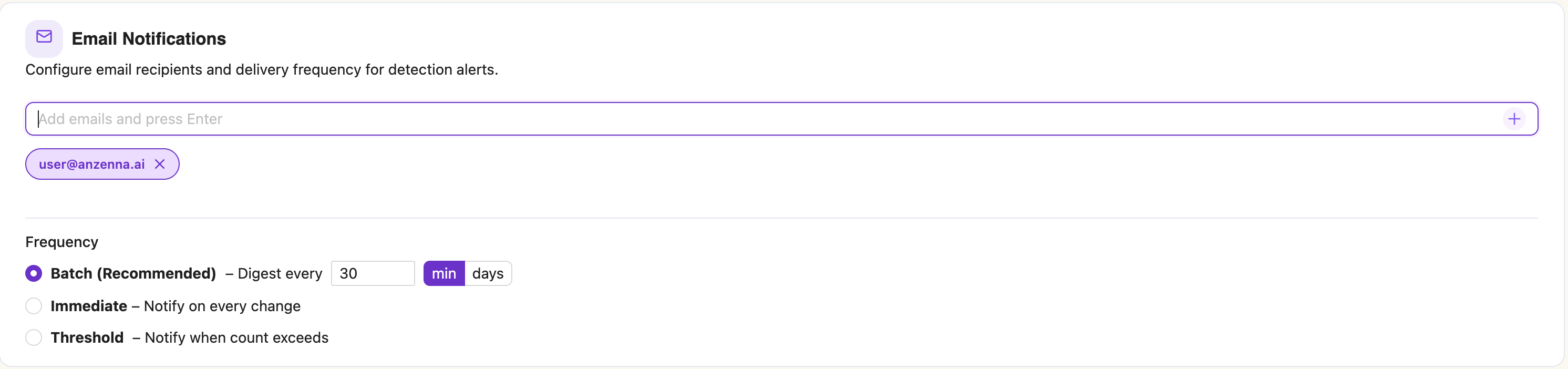 In Batch mode (the default), recipients receive a single digest email covering all detections with updates. In Immediate mode, a separate email is sent for each detection as soon as new events are found.