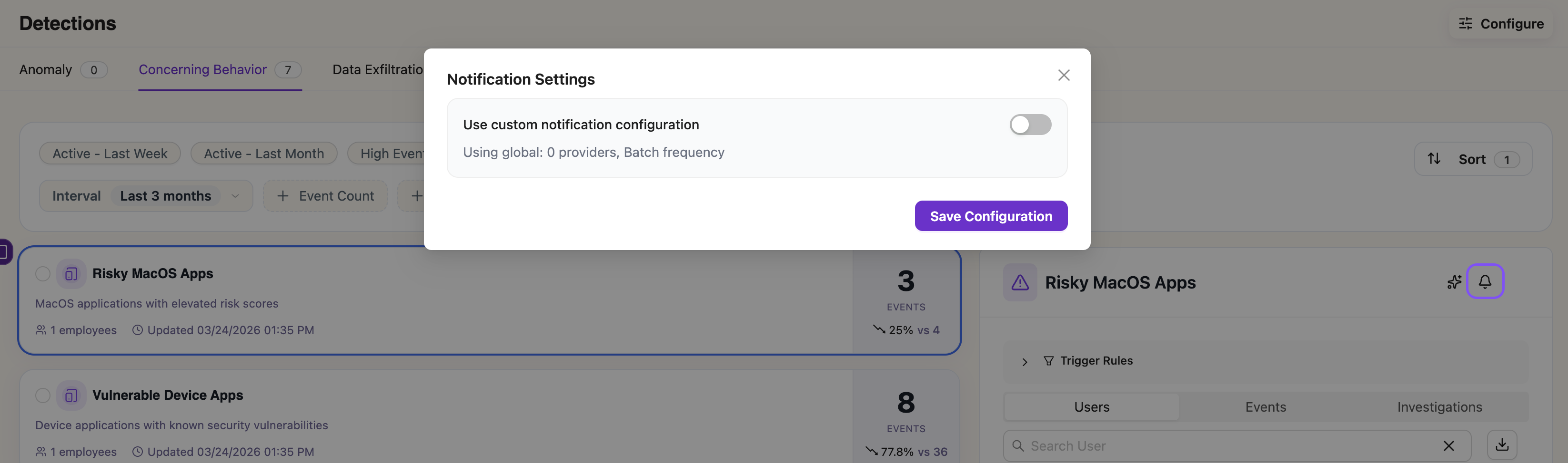 Email — A single digest email is sent periodically covering all detections with updates. The batch window is configurable (default: 60 minutes). Each detection in the digest shows its new event count, total count, and affected users.