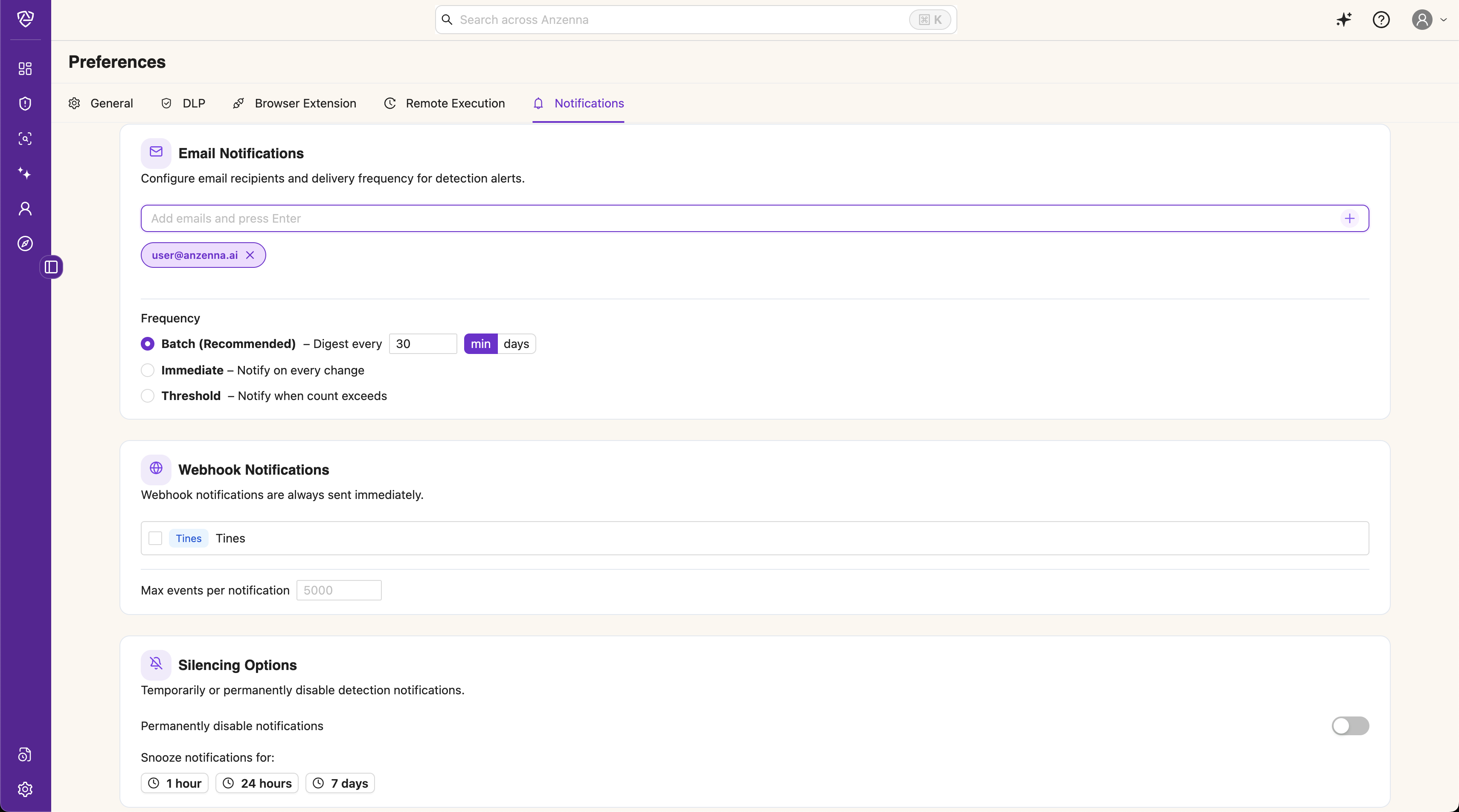 In Anzenna, go to Settings > Integrations and add a Tines integration with the webhook URL