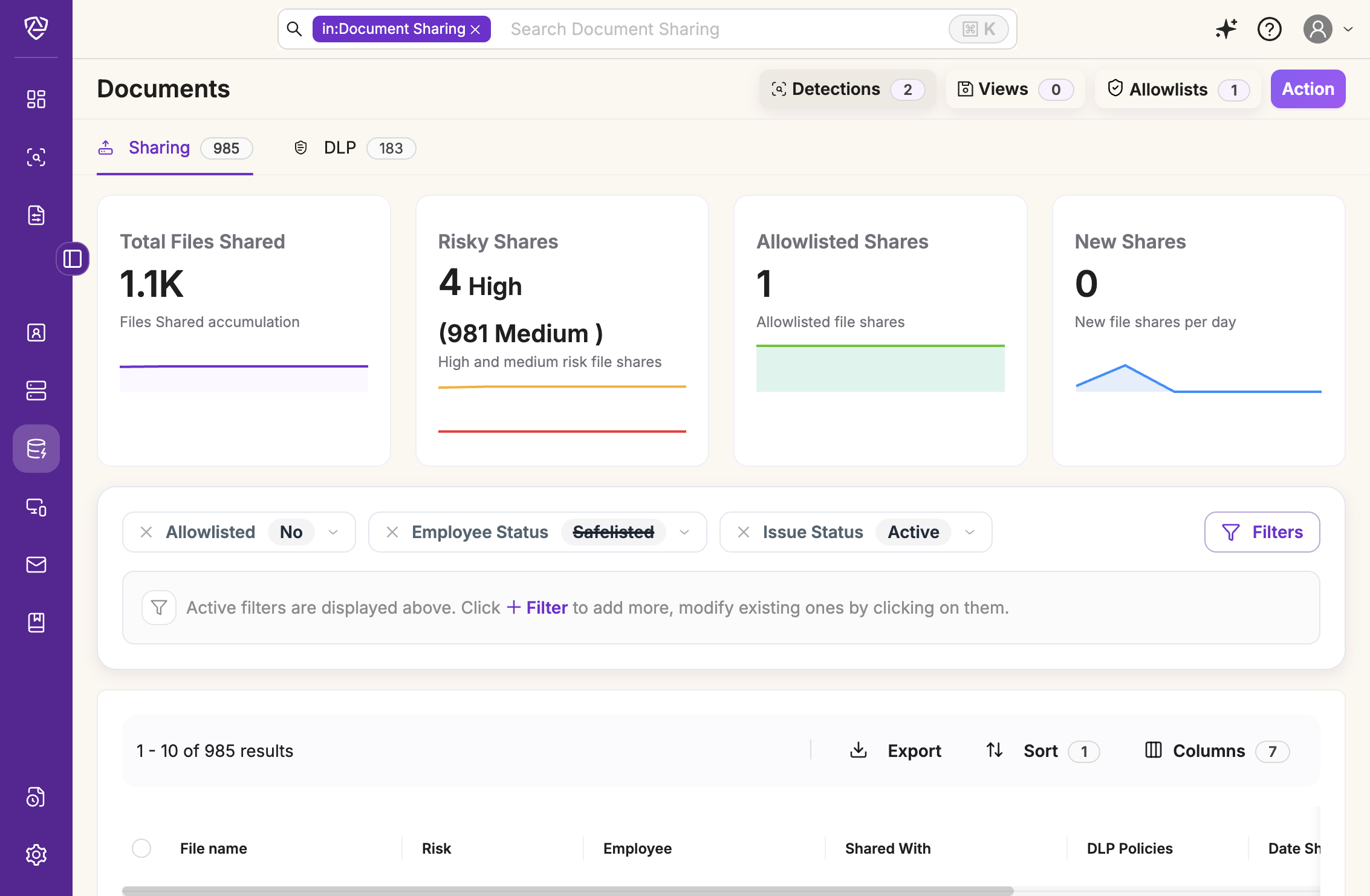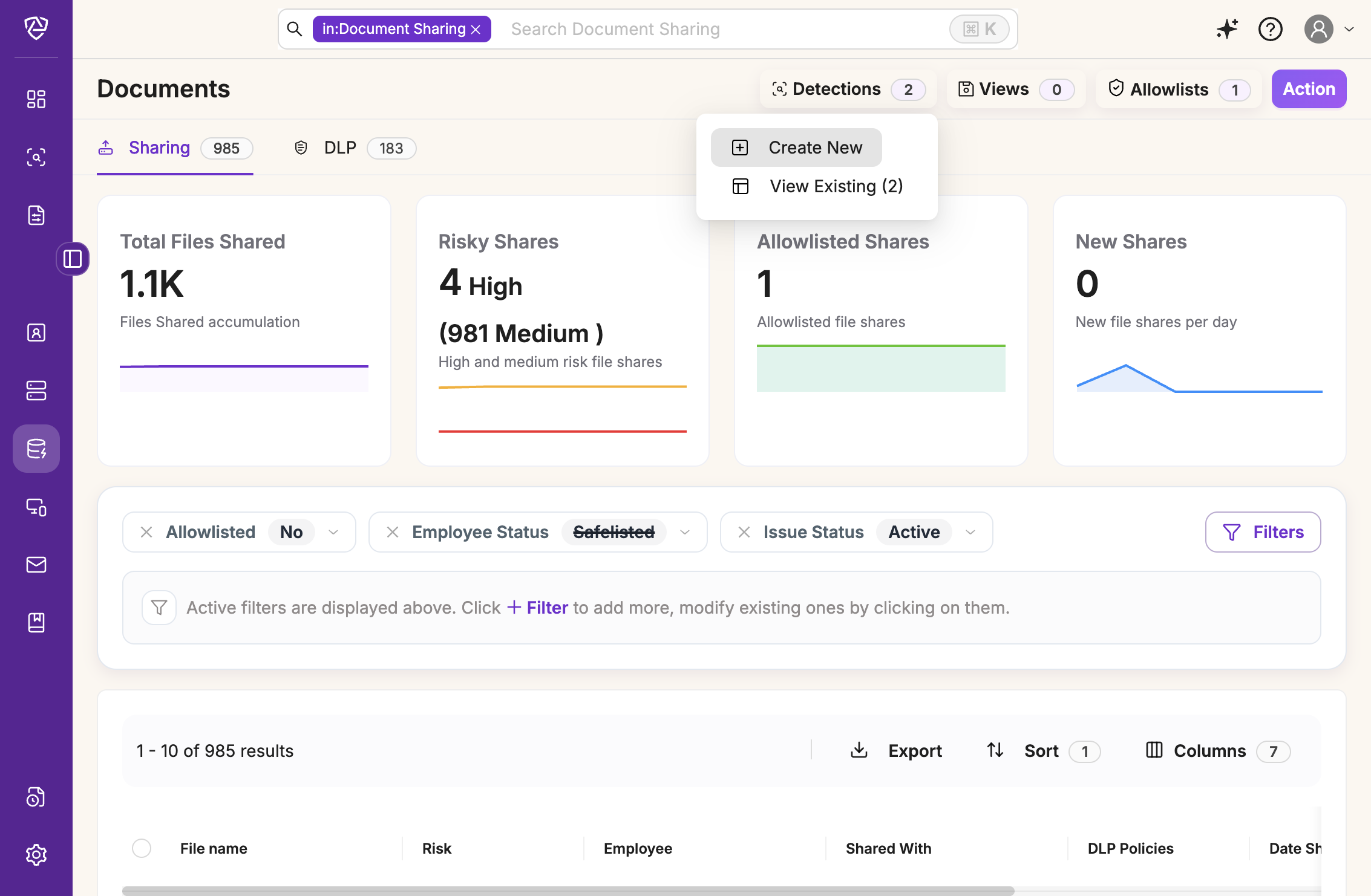 Navigate to an events dashboard (e.g., Documents, Browser History, SaaS)